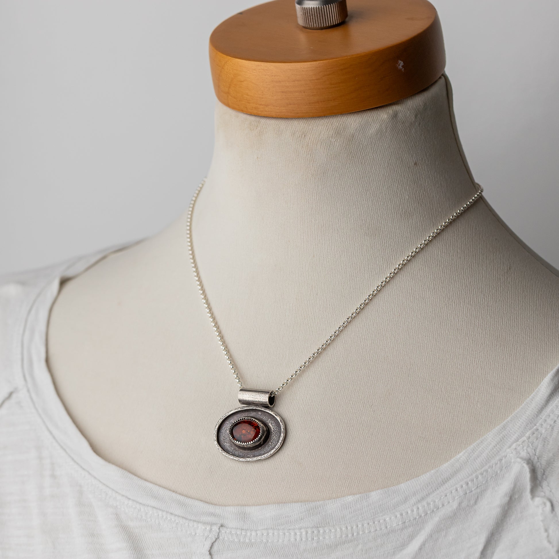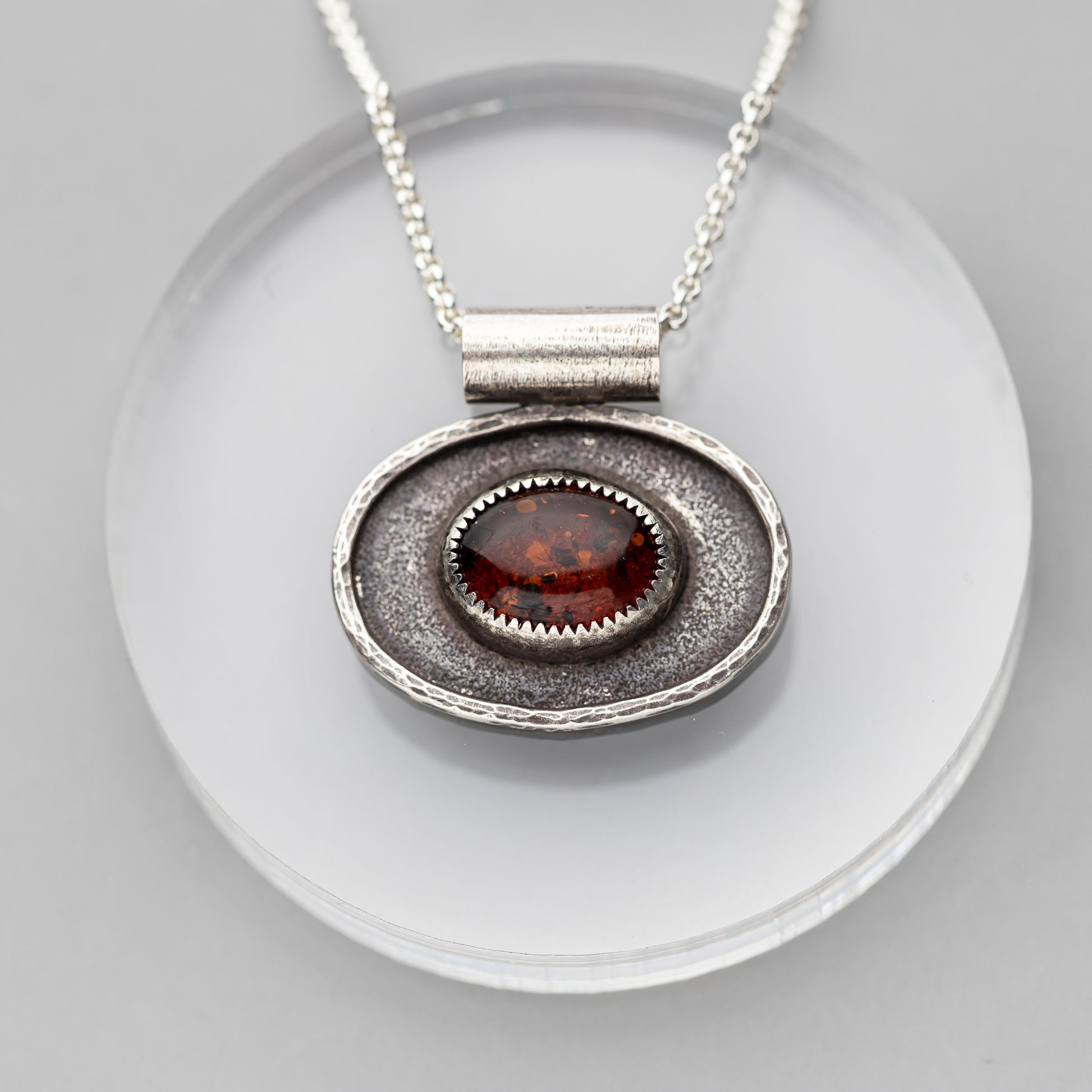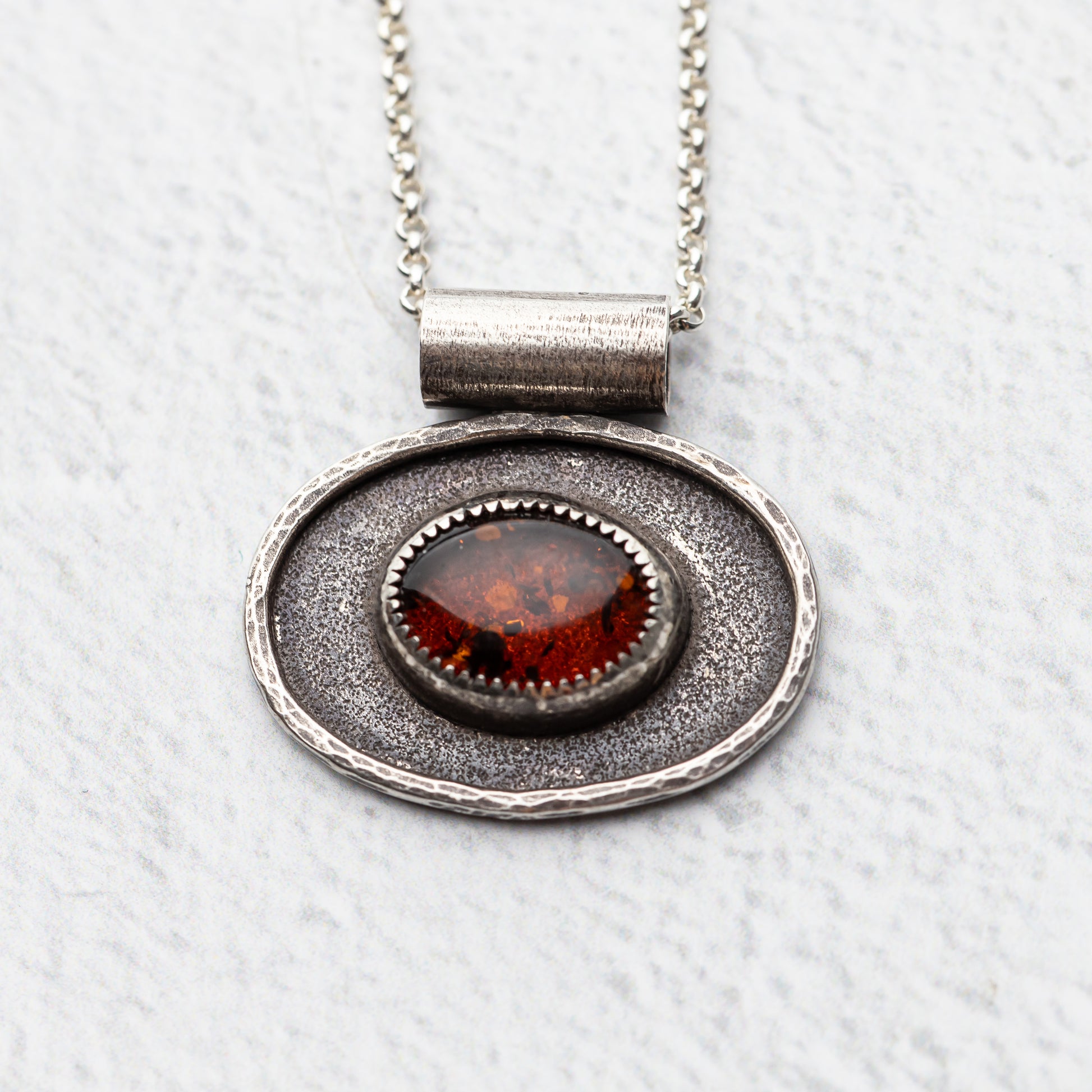 This gorgeous stone was a cool find at our last gem show! We don't see a lot of genuine amber and this one is so full of glowy inclusions when the light hits it. Paul created a custom bezel setting for the stone and placed it on a nice solid oval with a little hammered silver frame around the stone. The background is textured and he oxidized the pendant before polishing so it has a lovely dark patina.