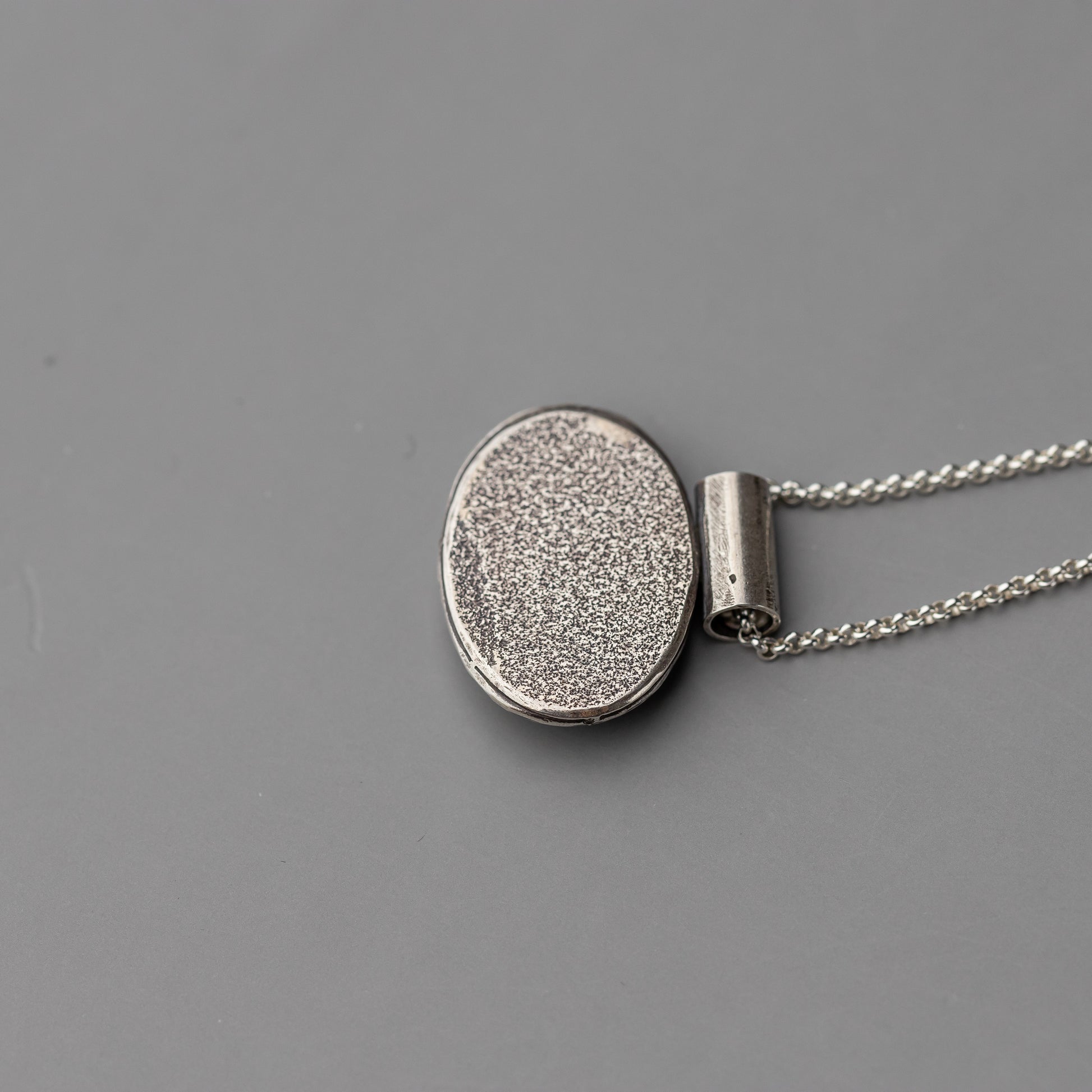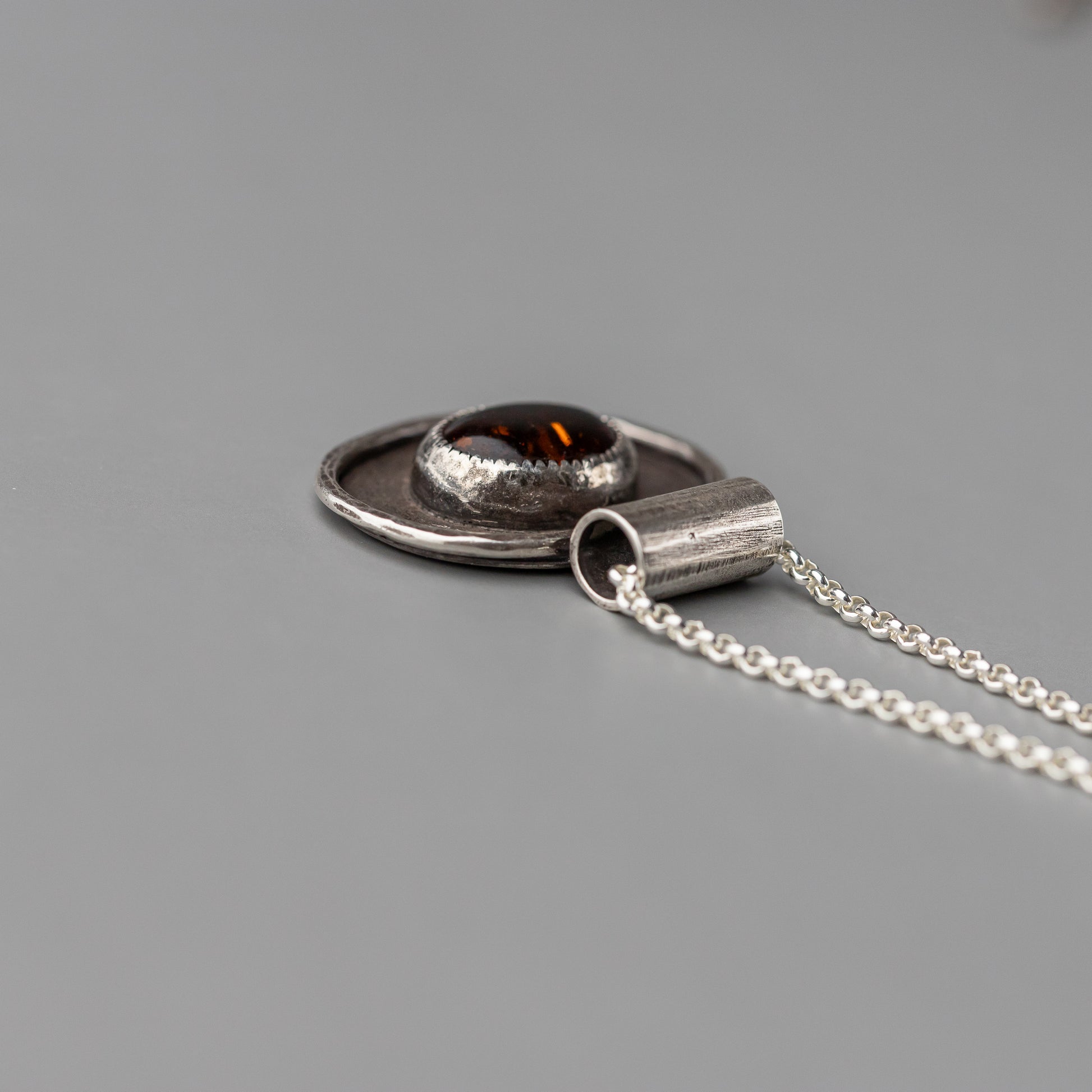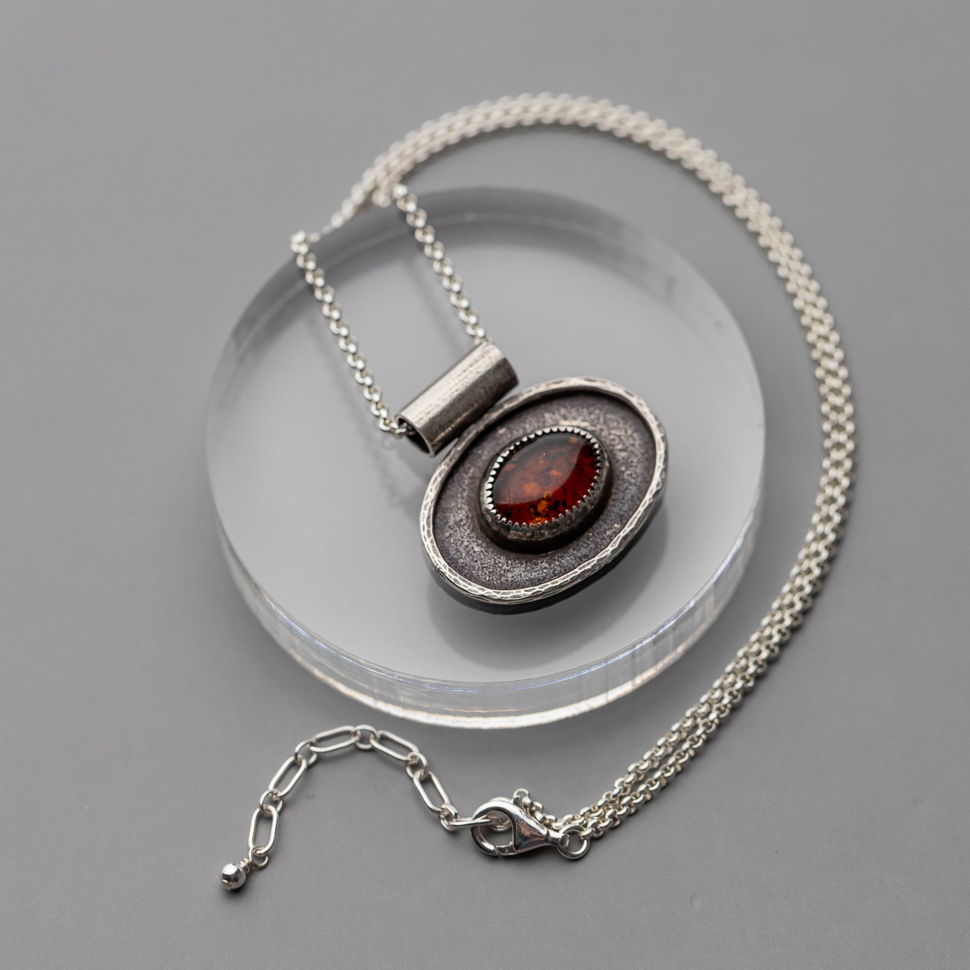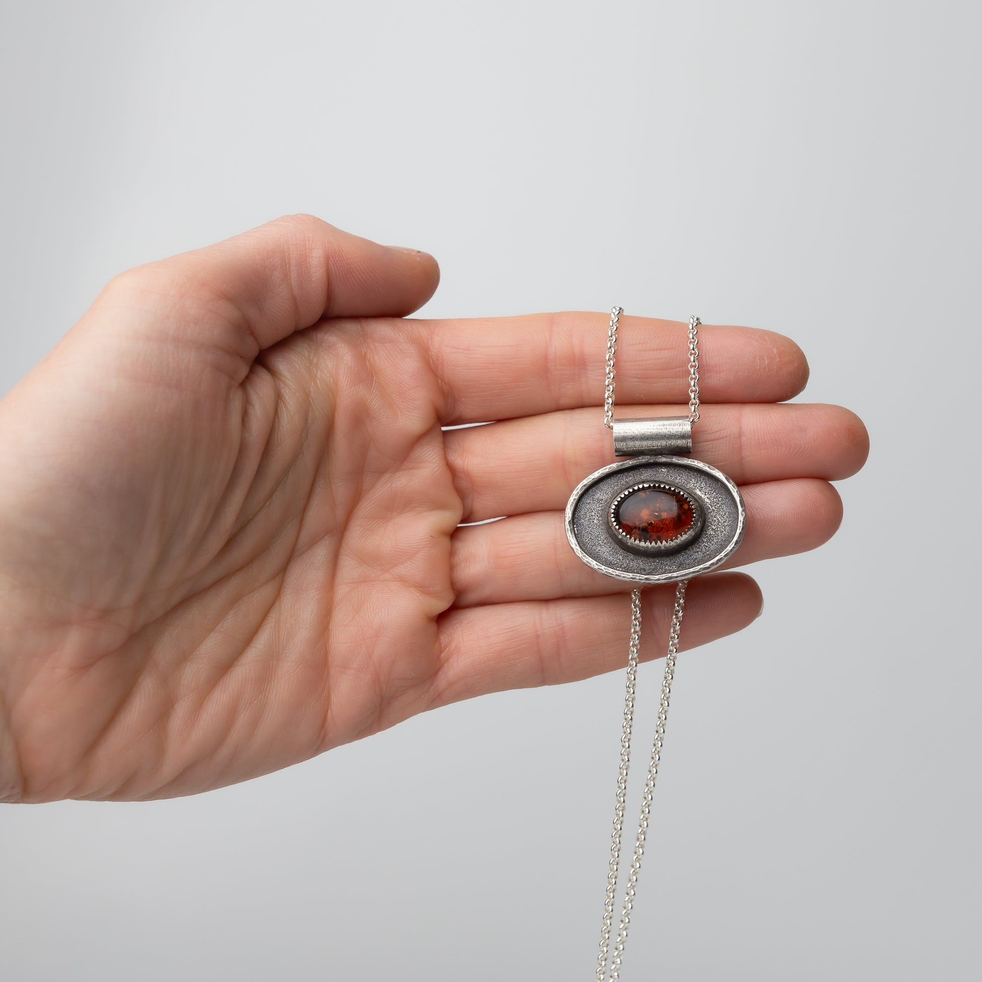 This gorgeous stone was a cool find at our last gem show! We don't see a lot of genuine amber and this one is so full of glowy inclusions when the light hits it. Paul created a custom bezel setting for the stone and placed it on a nice solid oval with a little hammered silver frame around the stone. The background is textured and he oxidized the pendant before polishing so it has a lovely dark patina.