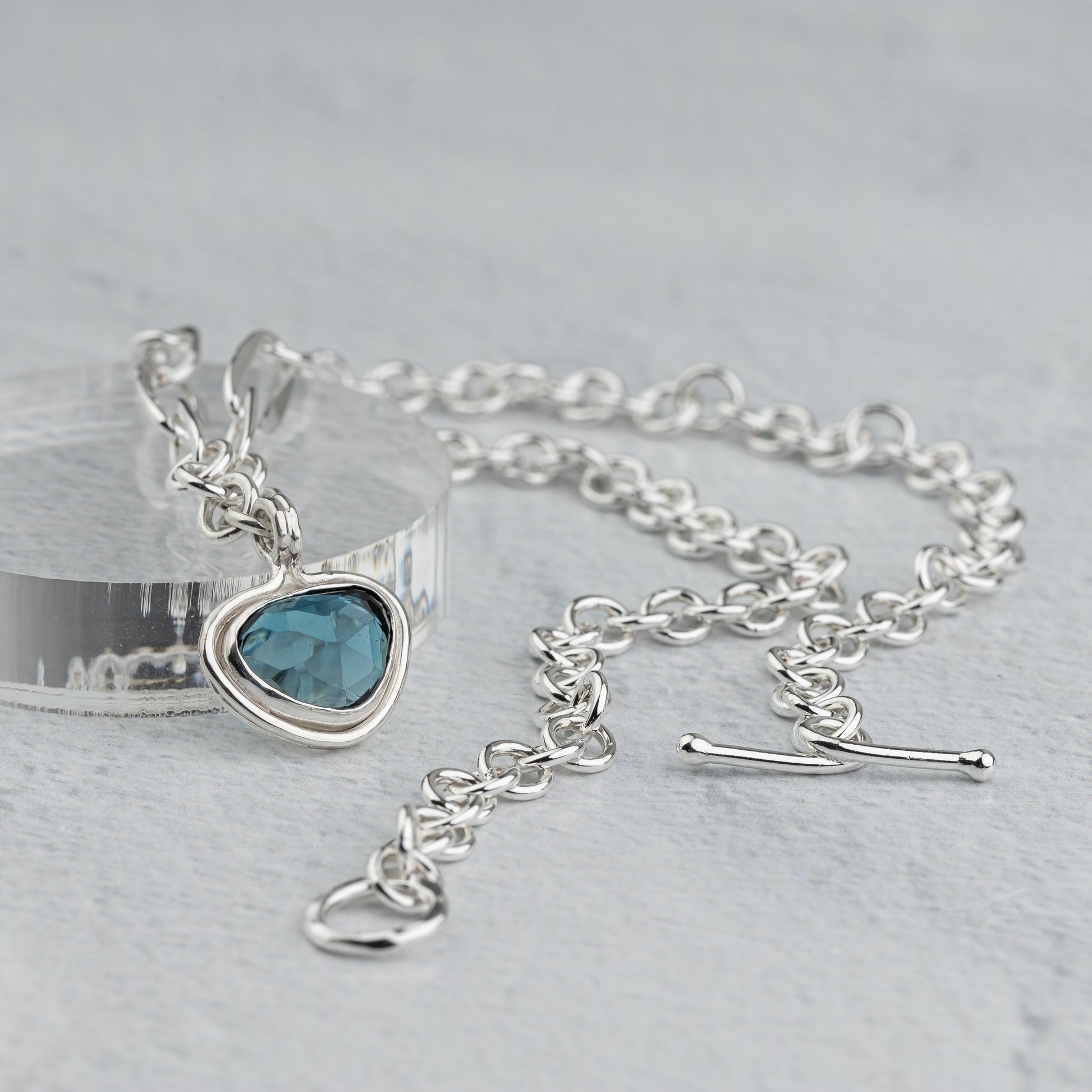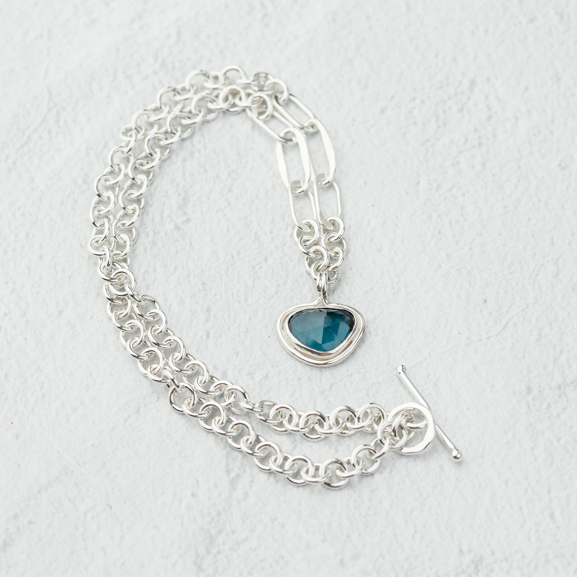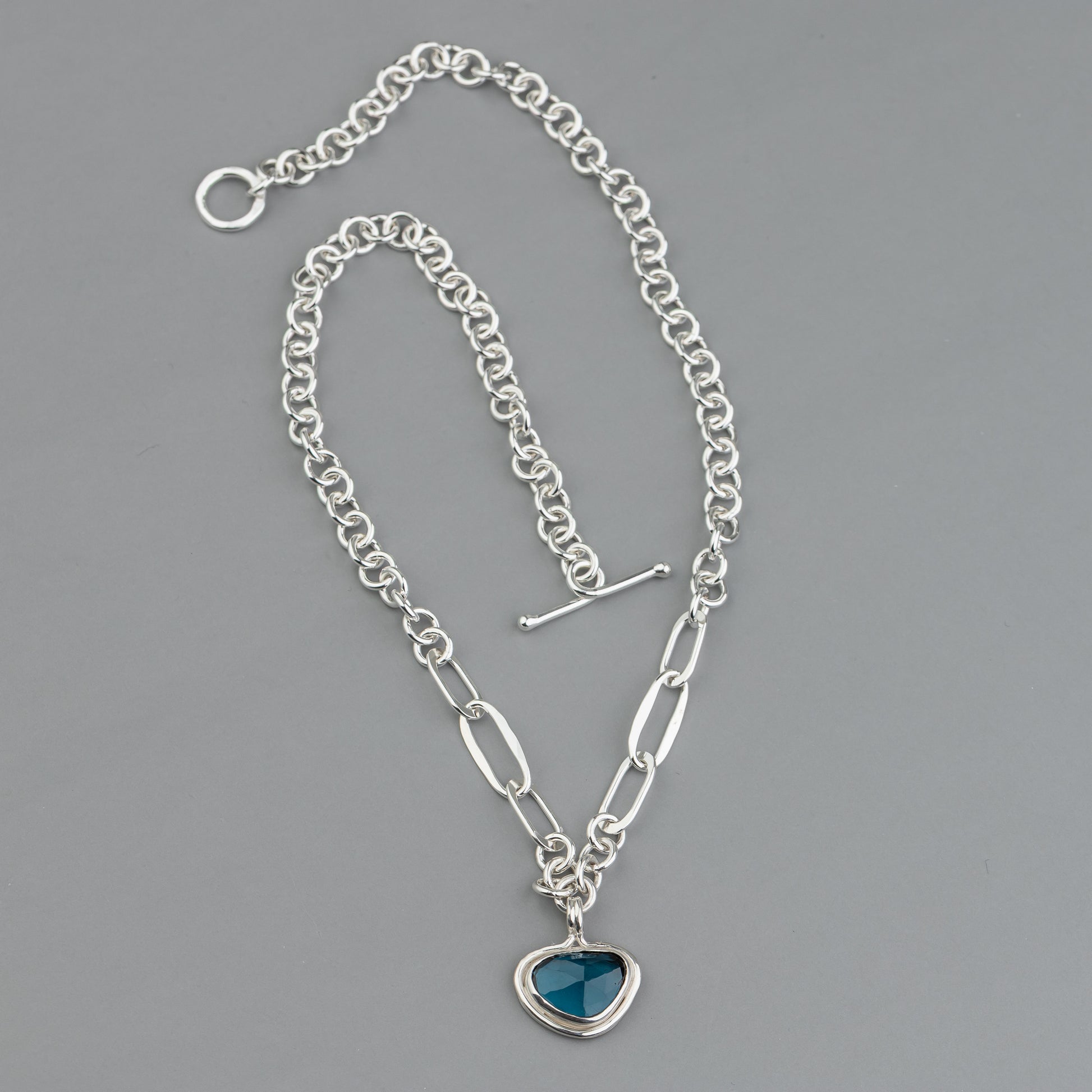Handmade with solid sterling silver and a 6 carat blue topaz gemstone. The chain is created link by link from solid Argentium silver with a toggle clasp for a truly unique one of a kind necklace.