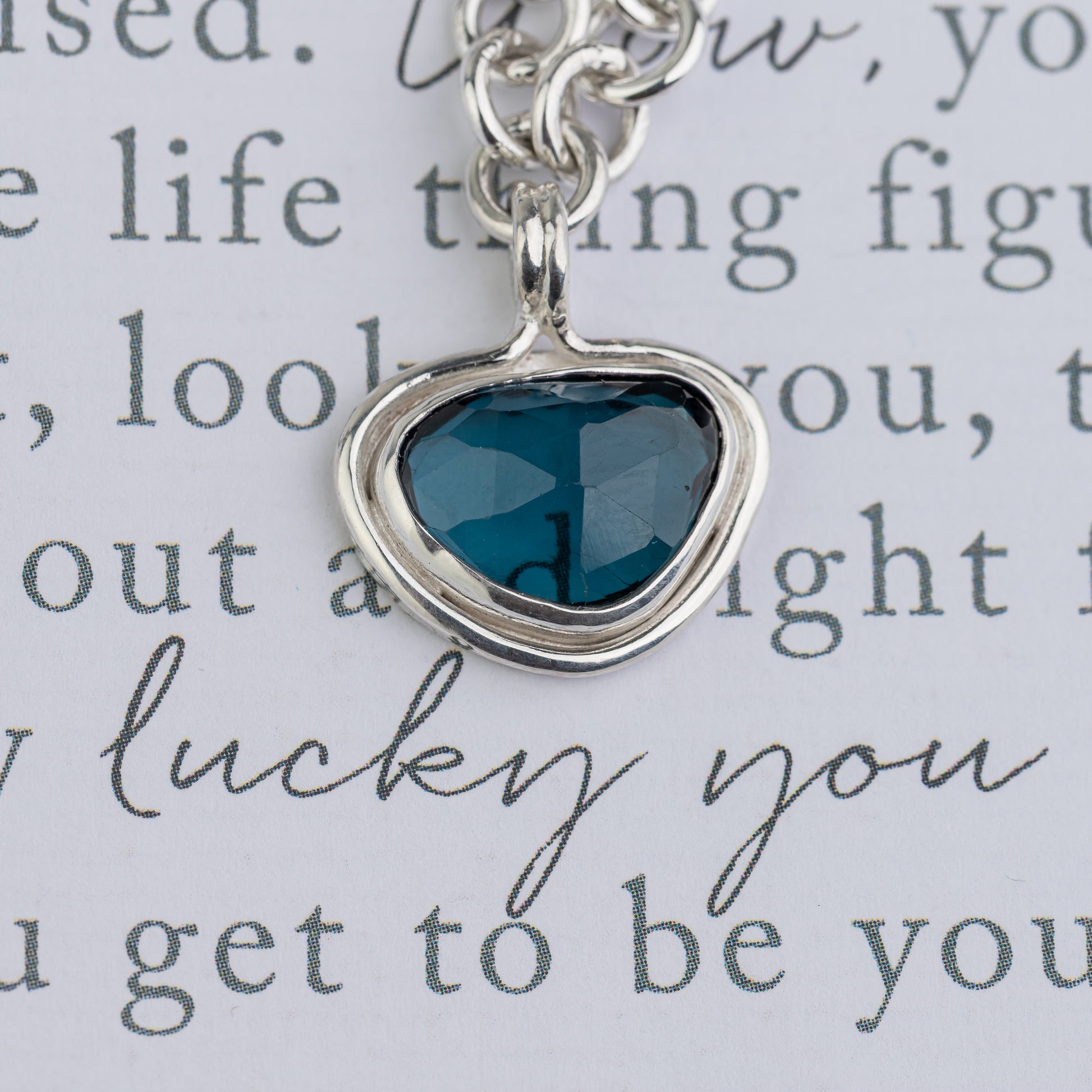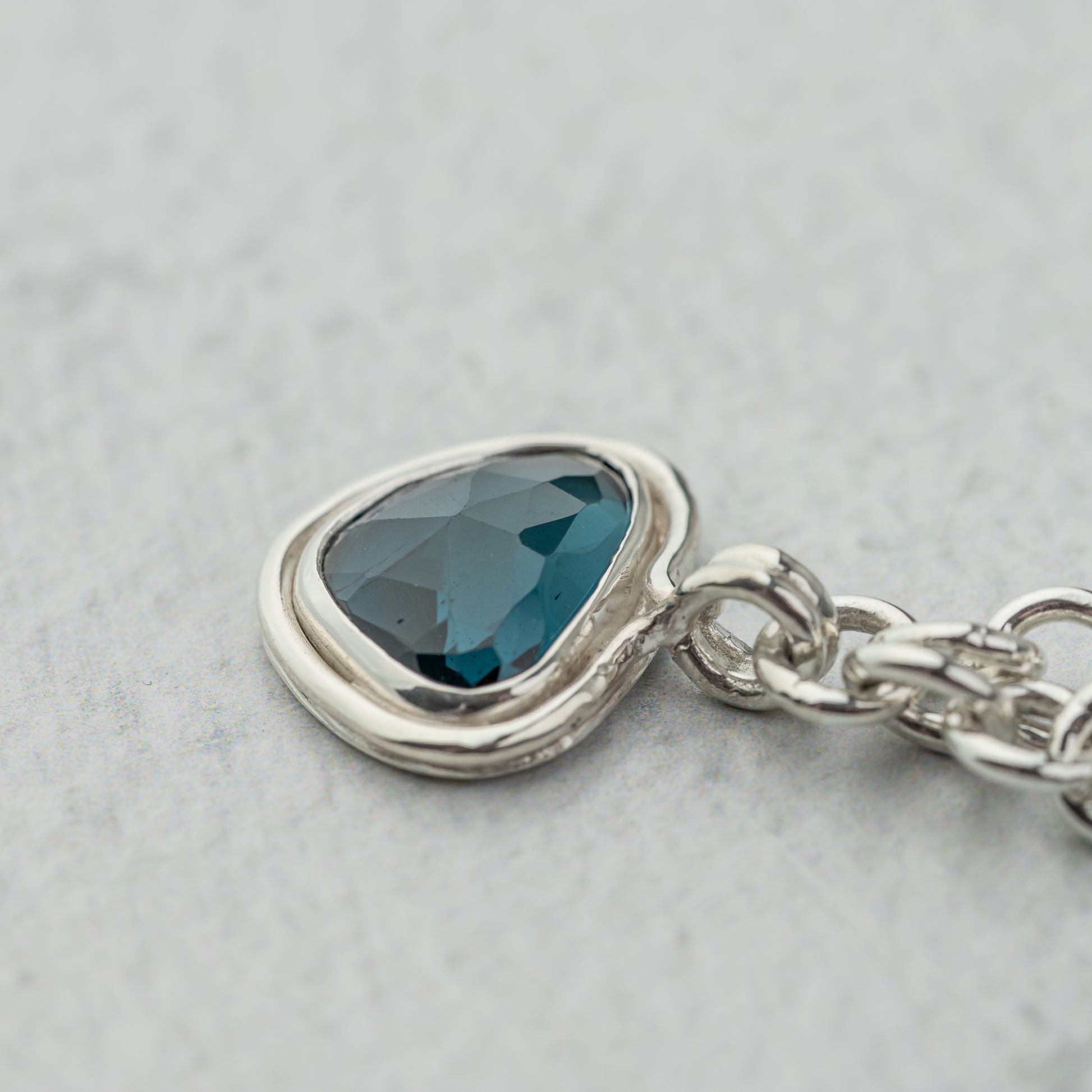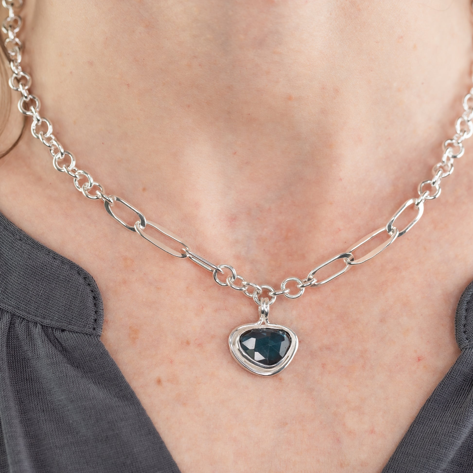 Handmade with solid sterling silver and a 6 carat blue topaz gemstone. The chain is created link by link from solid Argentium silver with a toggle clasp for a truly unique one of a kind necklace.