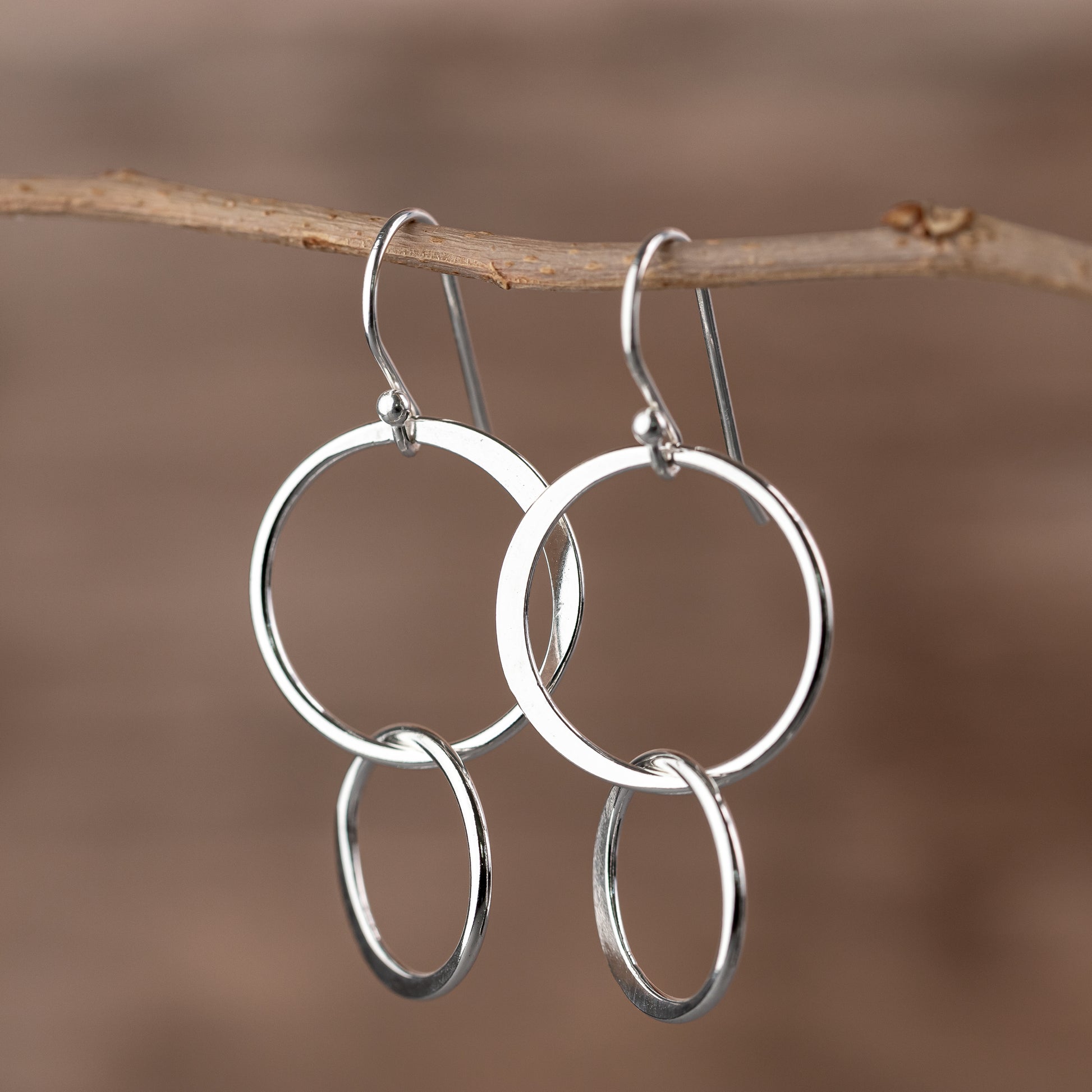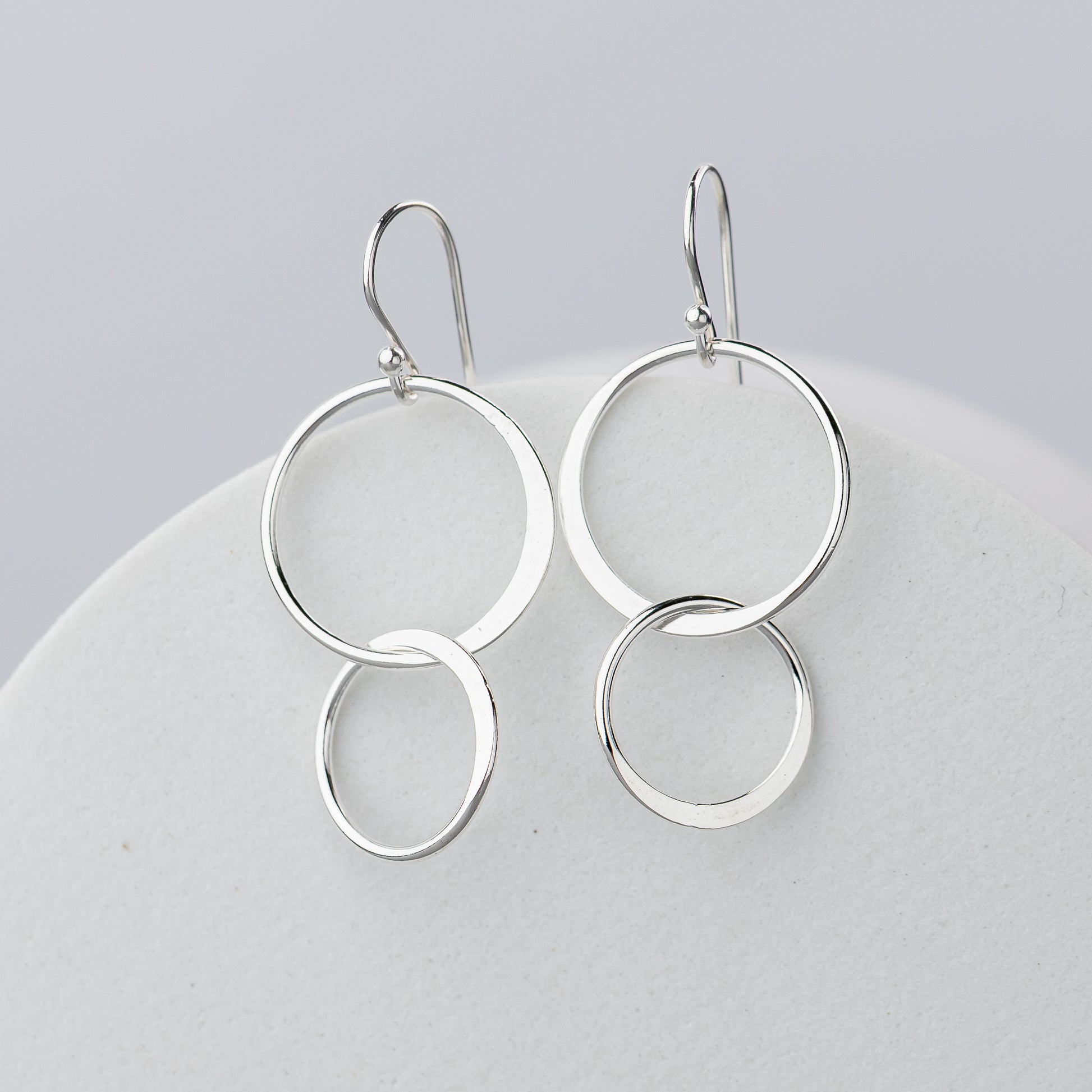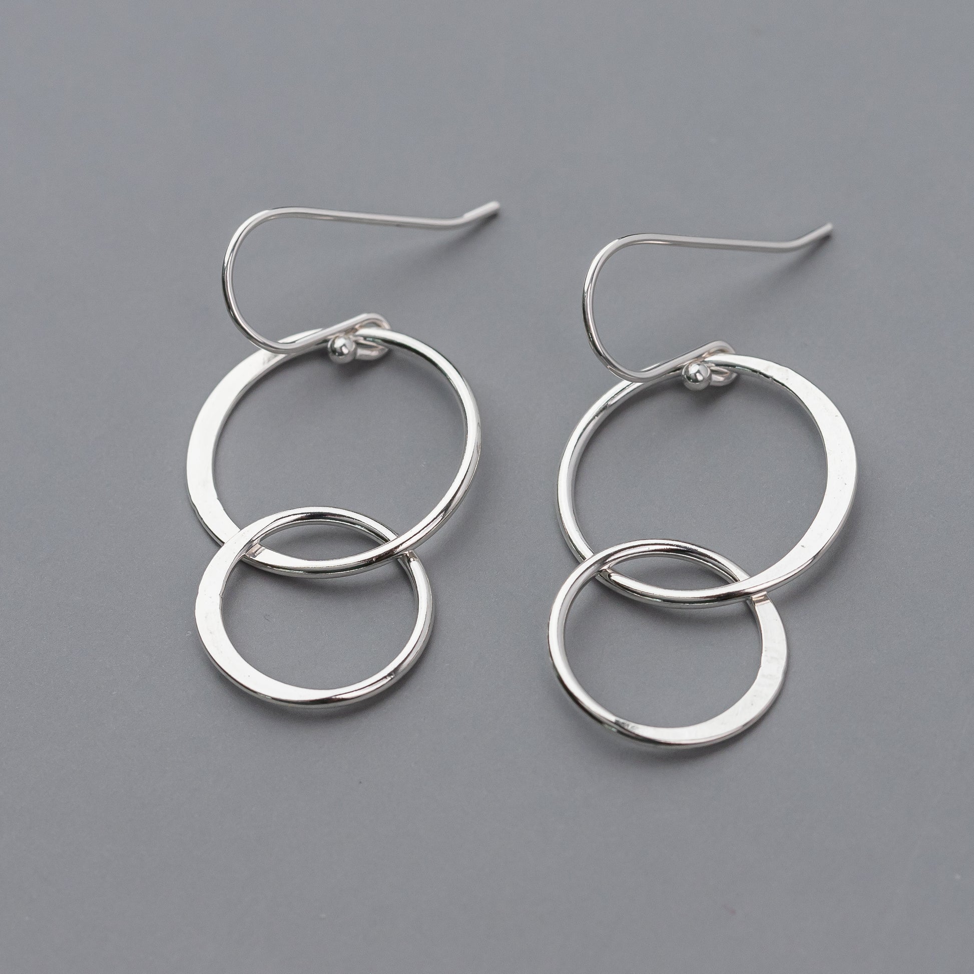 We handcraft these earrings from Argentium® sterling silver wire, forming and welding each circle by hand. Once linked together, each shape is hammered in one spot to create a small, flat facet that catches the light from different angles as you move. The result is a pair of earrings that are clean, modern, and full of subtle detail. They're lightweight, comfortable, and easy to dress up or down.