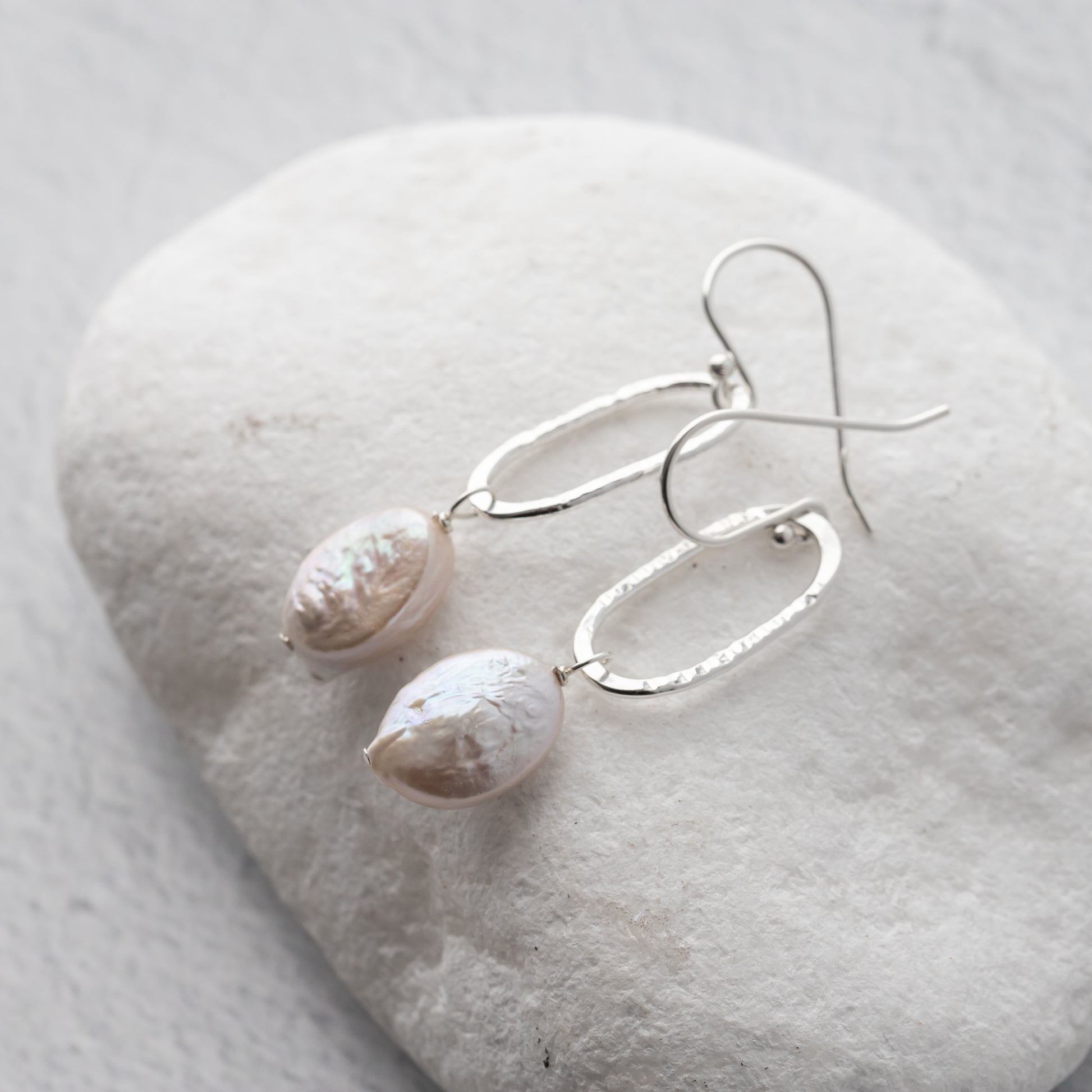 These pearl dangle earrings are handmade in our studio with solid, nickel free Argentium Sterling Silver and natural freshwater pearls. The sterling silver ovals are carefully shaped and hand hammered for texture and dimension. They are polished to a high shine to catch the light just right and are designed to be lightweight and comfortable to wear. When we found these oval shaped freshwater pearls I thought they were so unique and I love how they pair with this silver oval above. Perfect for everyday these can easily be dressed up or down.
