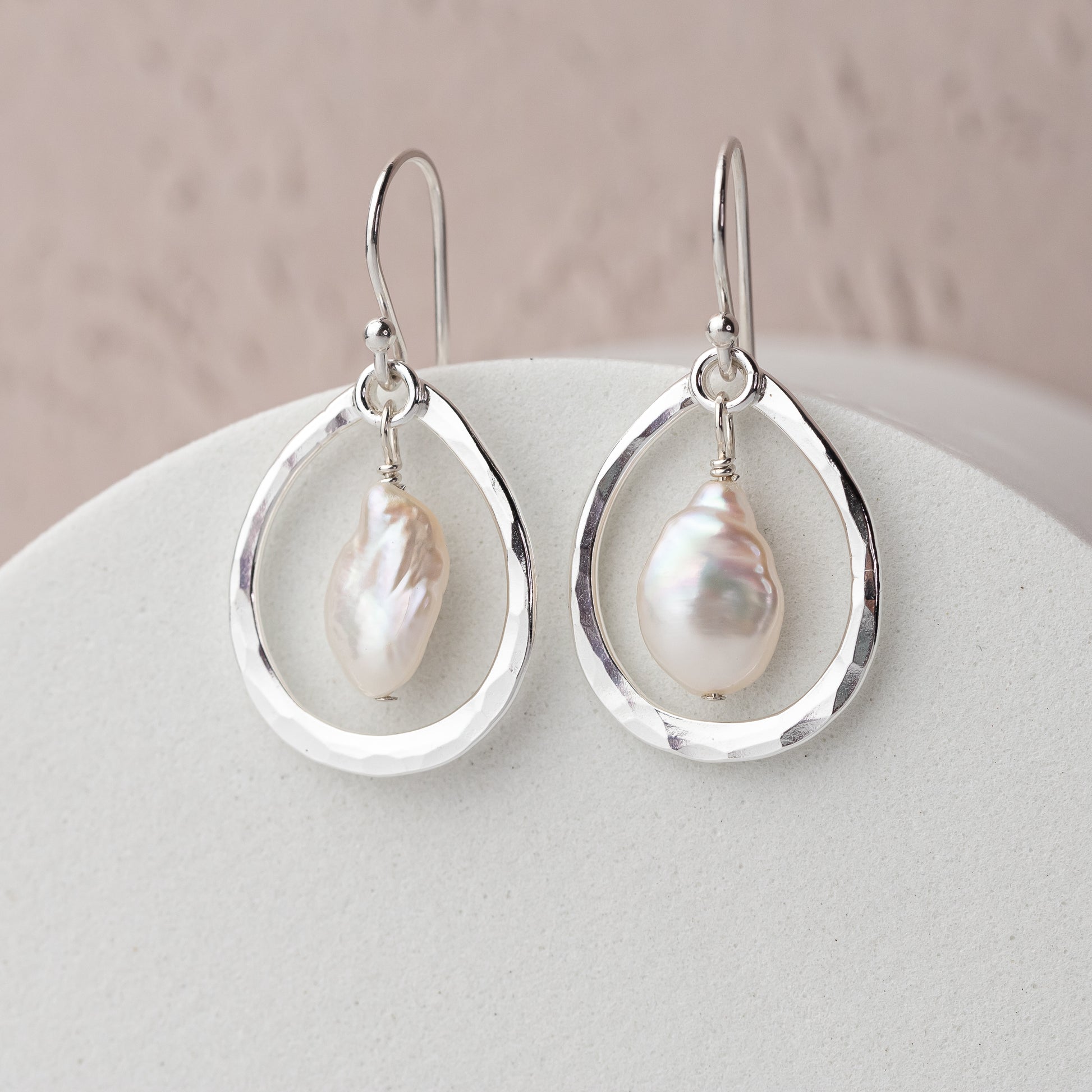 Handmade with gorgeous grade A natural freshwater pearls and solid sterling silver, these unique earrings are perfect for any occasion! Hand hammered for texture and dimension, then polished to a high shine to catch the light beautifully.