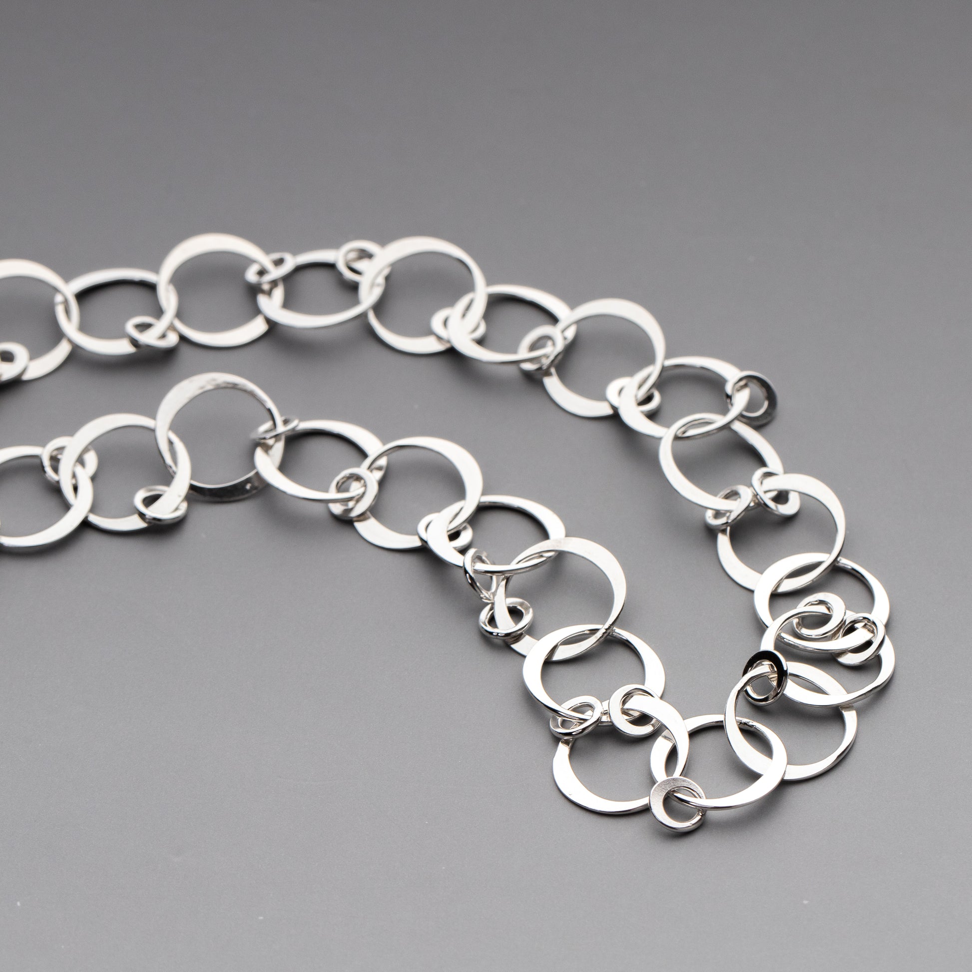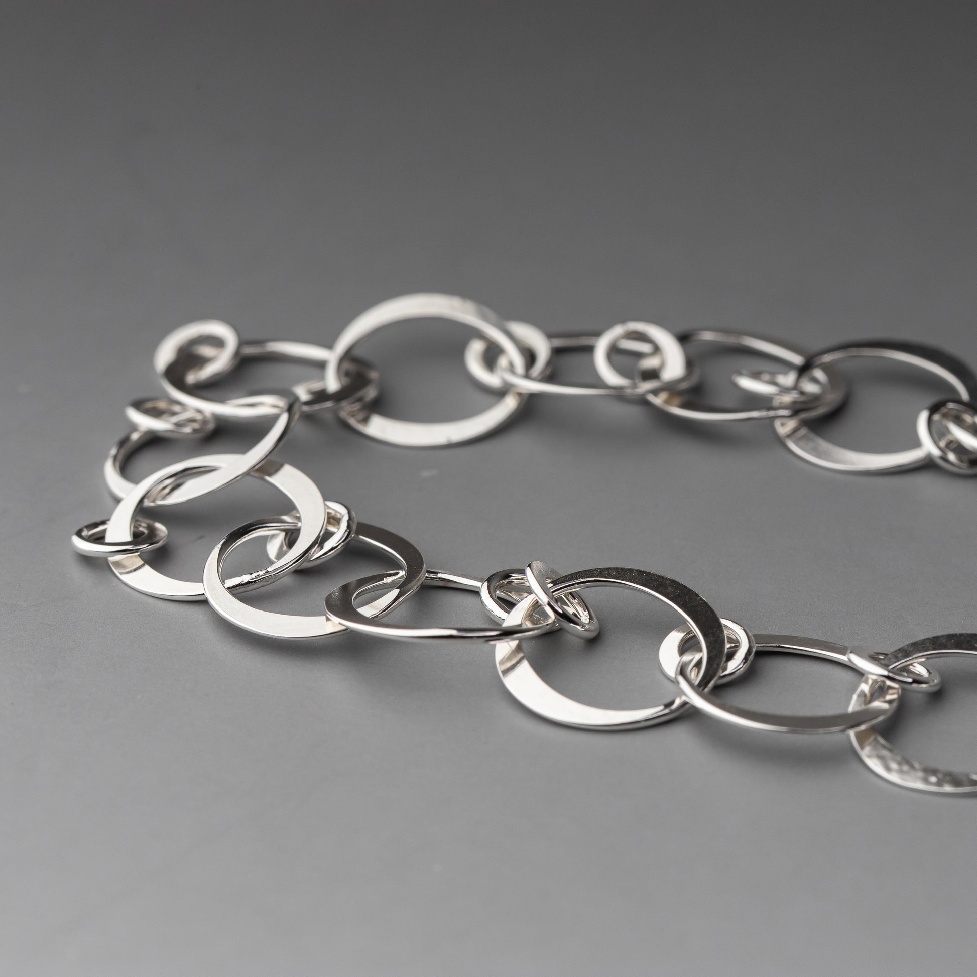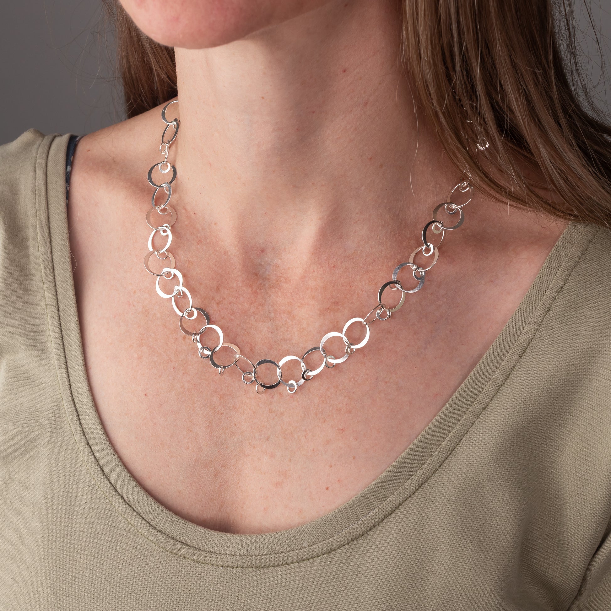 This handcrafted silver chain is made link by link in our Connecticut studio using Argentium Sterling Silver. Each circle is shaped, welded closed, and hammered by hand for dimension then tumble polished to reflect the light beautifully. Designed to be both sturdy and comfortable, it’s a versatile piece you’ll love wearing every day.