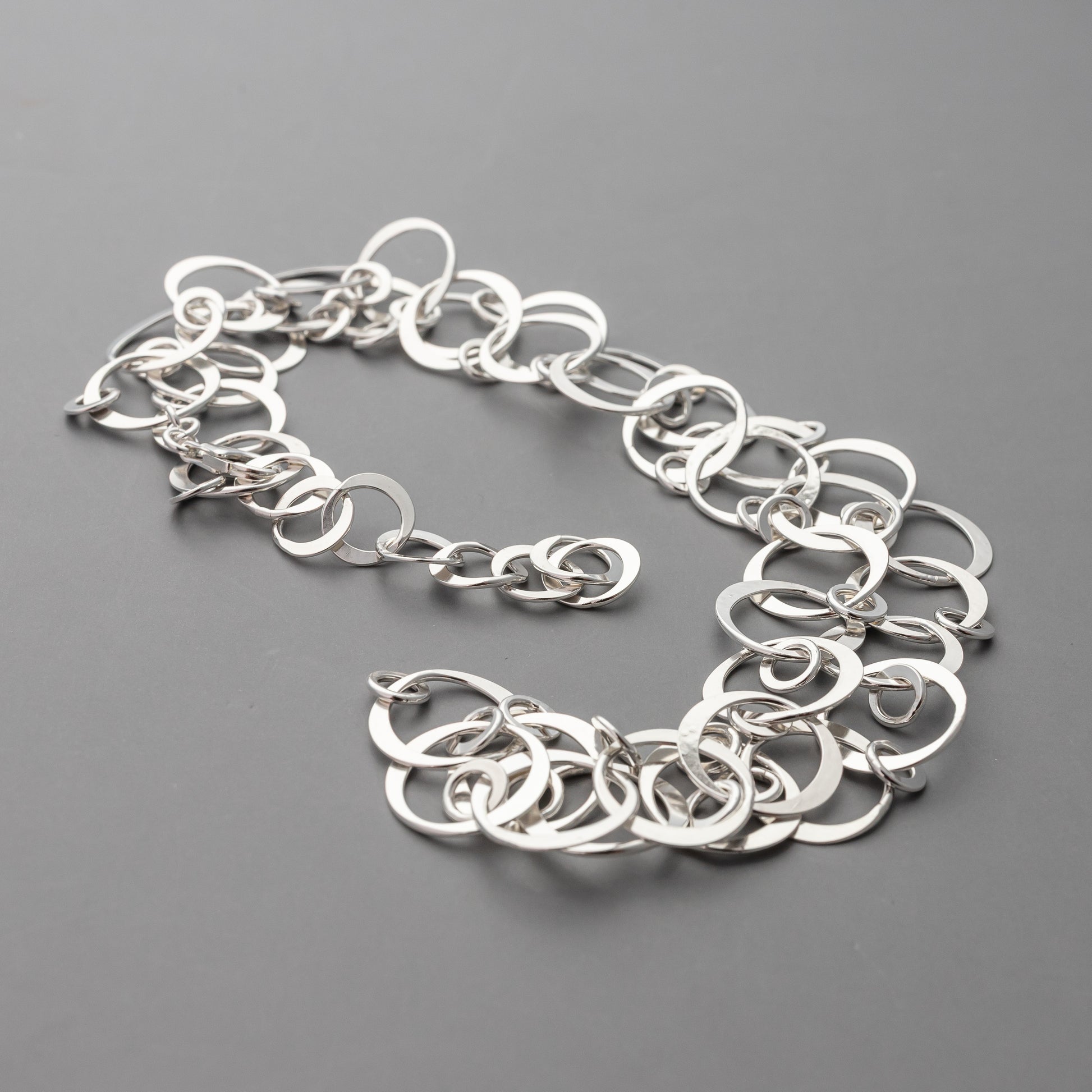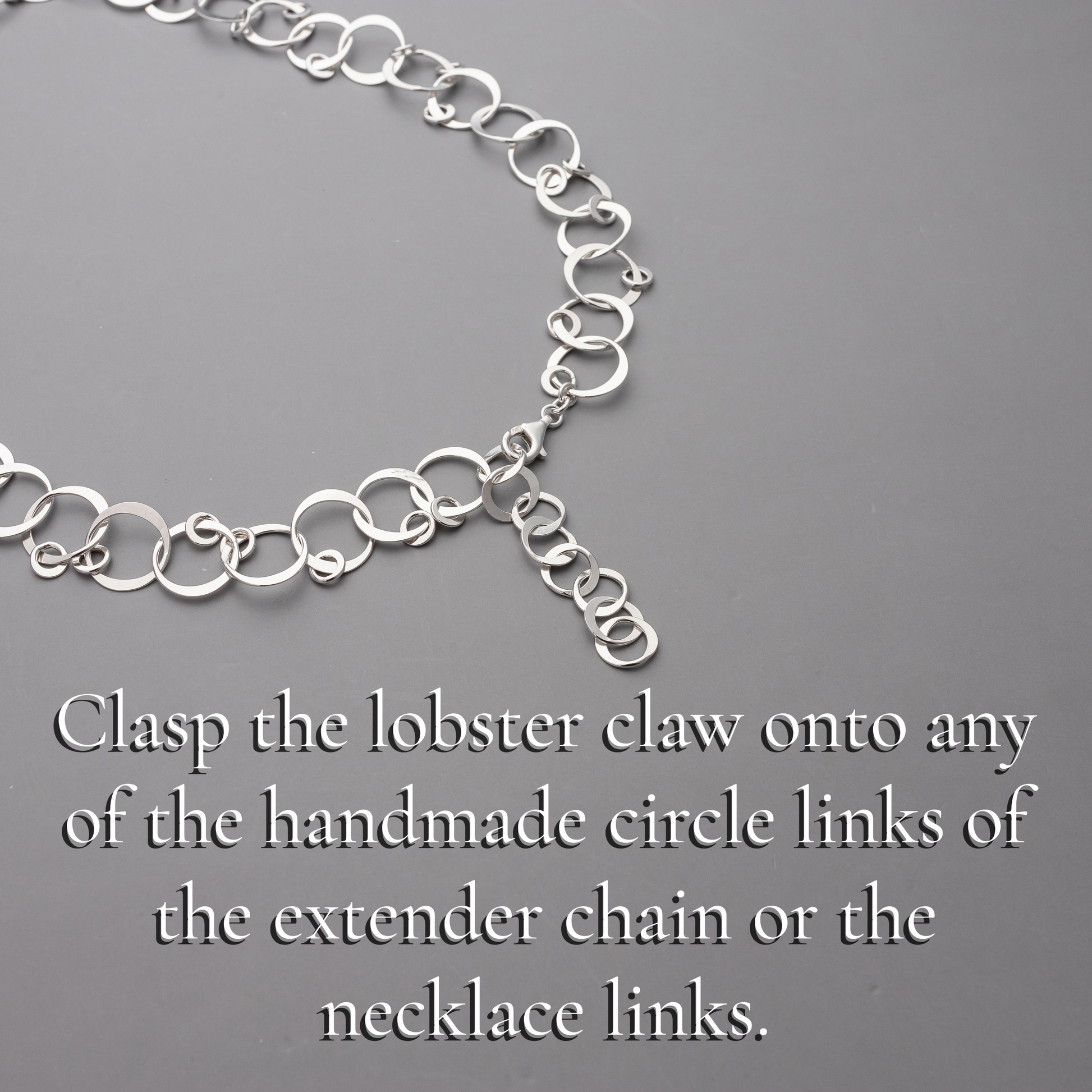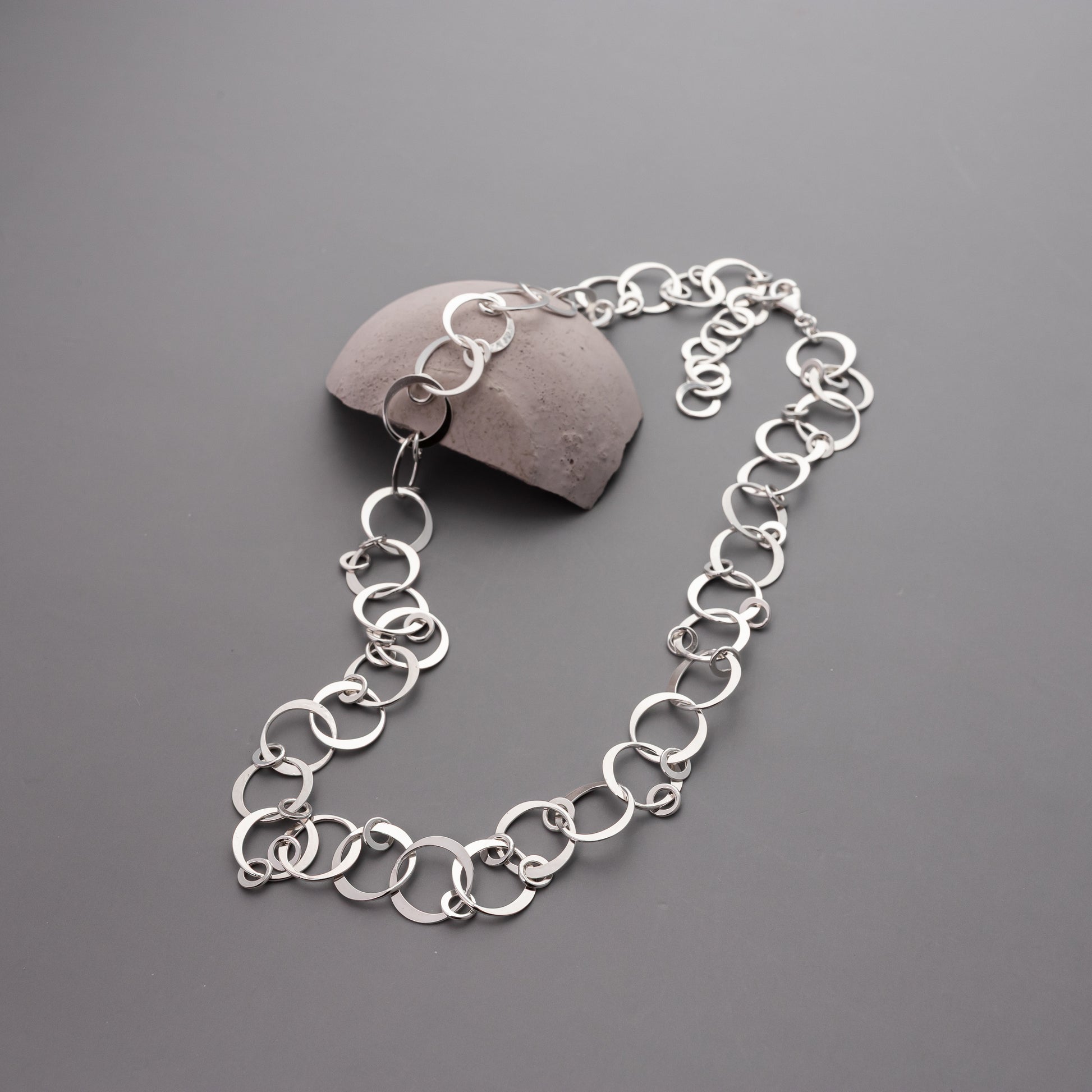This handcrafted silver chain is made link by link in our Connecticut studio using Argentium Sterling Silver. Each circle is shaped, welded closed, and hammered by hand for dimension then tumble polished to reflect the light beautifully. Designed to be both sturdy and comfortable, it’s a versatile piece you’ll love wearing every day.
