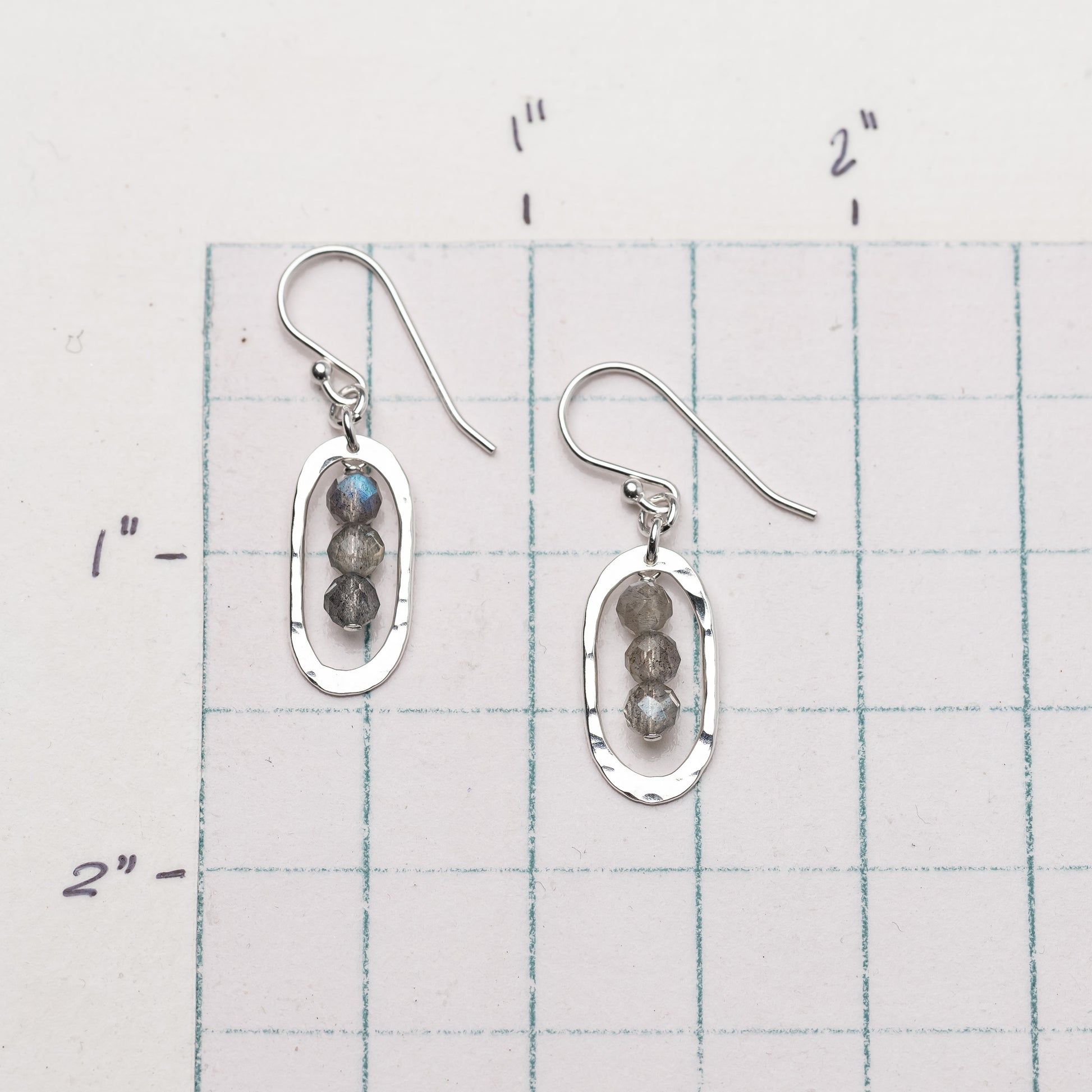 We form each oval drop by hand, hammering for texture and dimension, then subtly flaring the top and bottom for added design detail. The hammered facets catch and reflect light beautifully, while the faceted labradorite beads suspended inside the oval add sparkle and subtle flashes of blue, green, and gold. Finished to a brilliant shine, these earrings are easy to wear with everything!