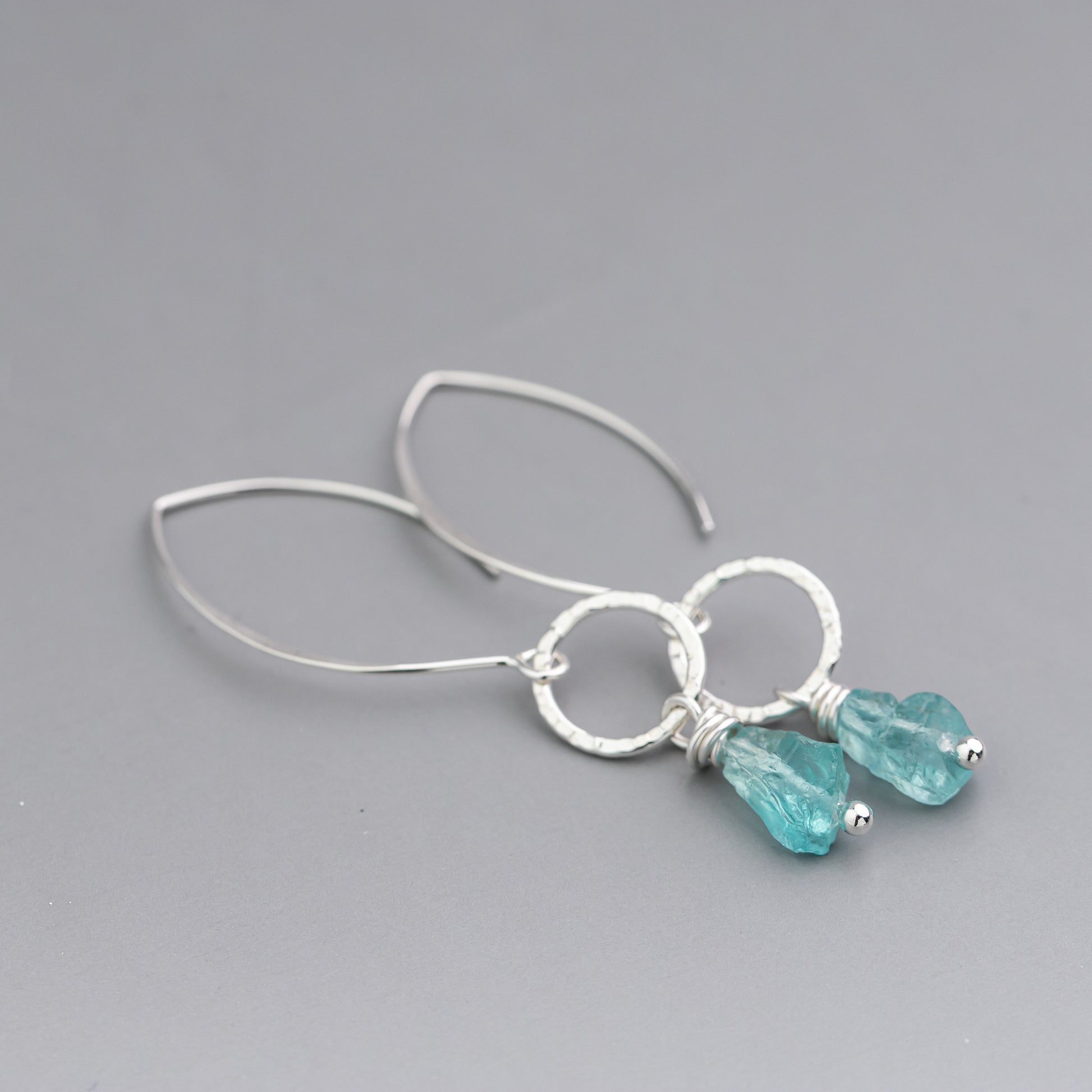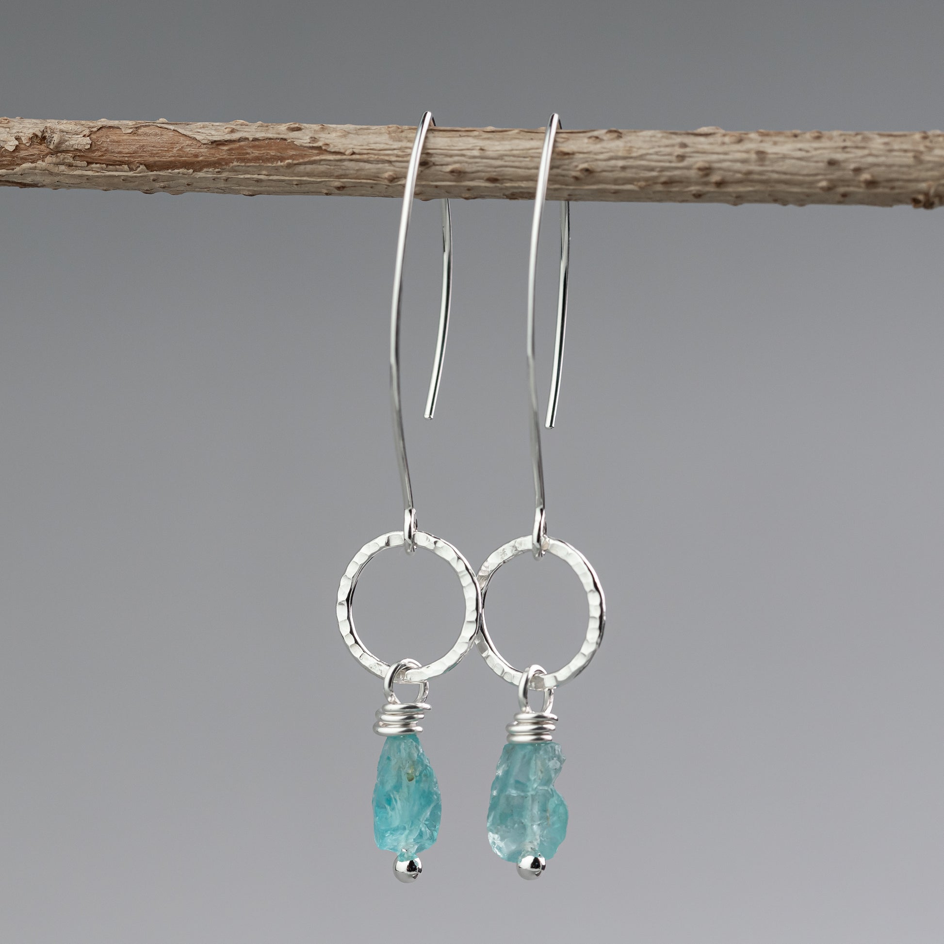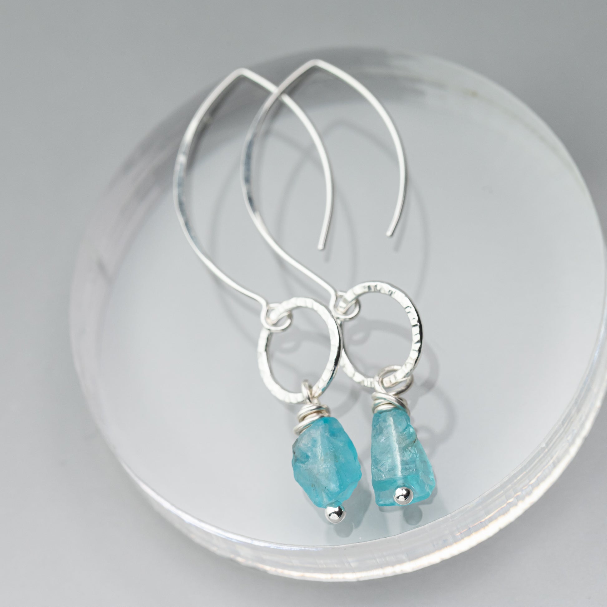 Handmade sterling silver earrings featuring natural raw blue apatite crystals, designed as lightweight everyday earrings with an organic, understated feel.