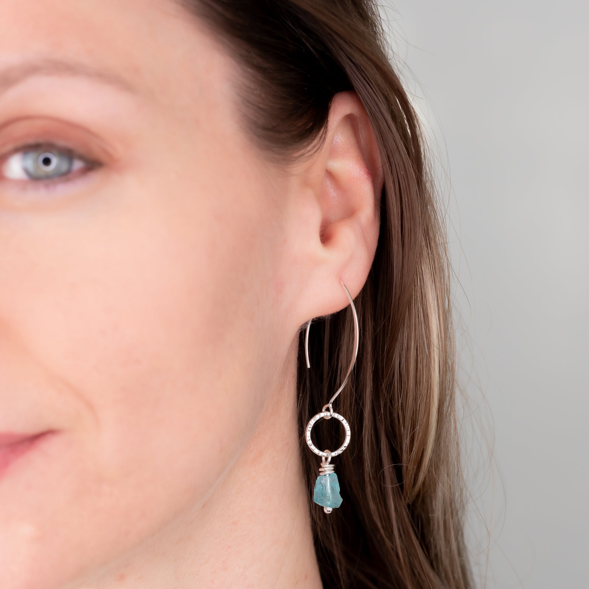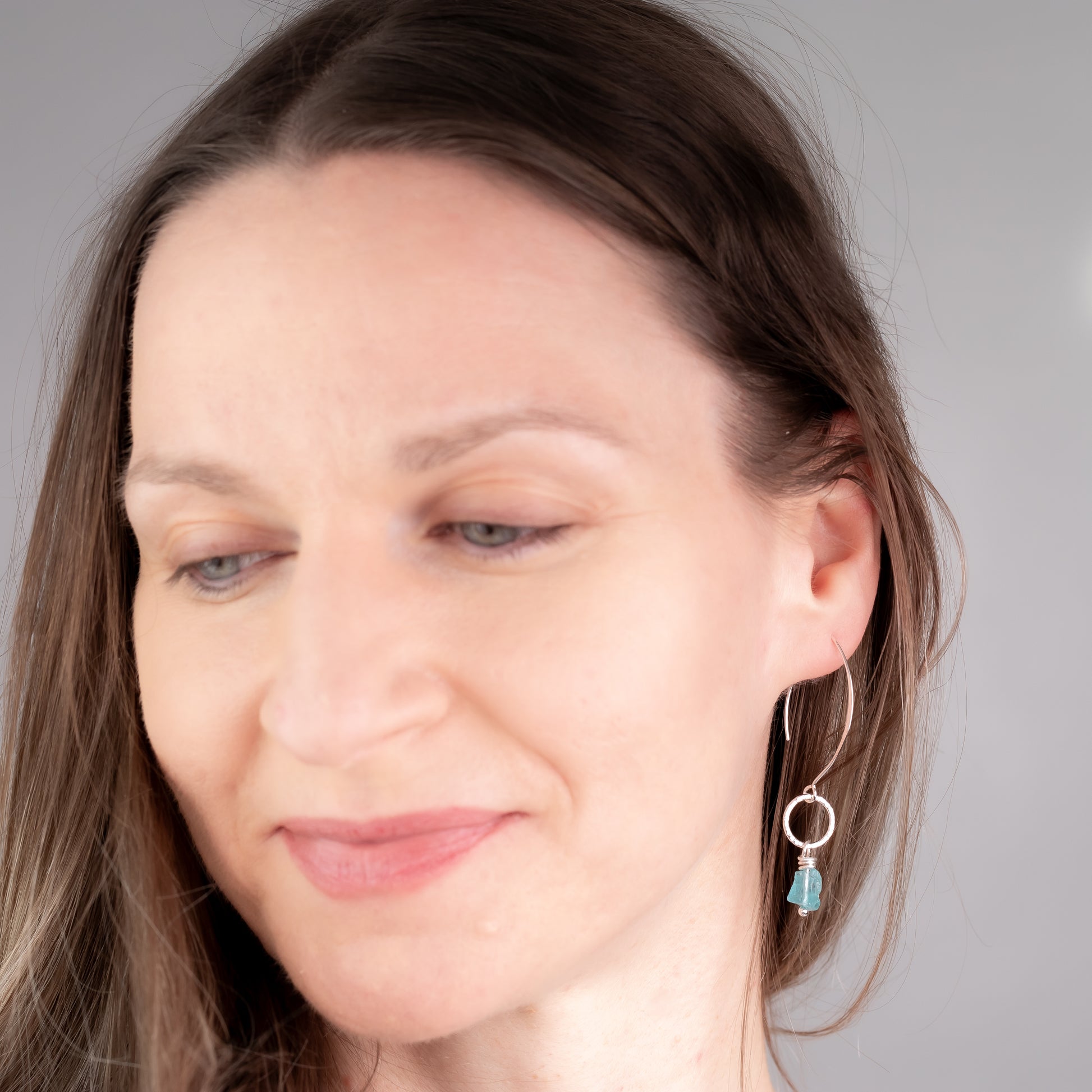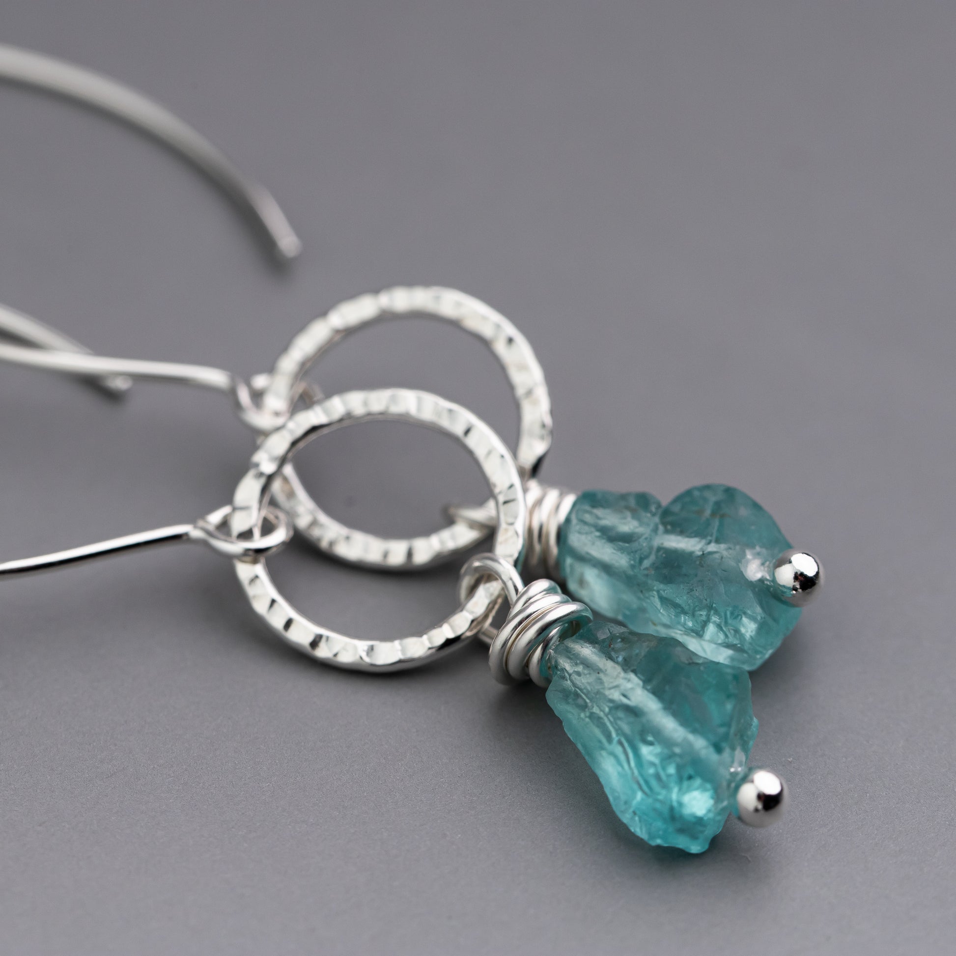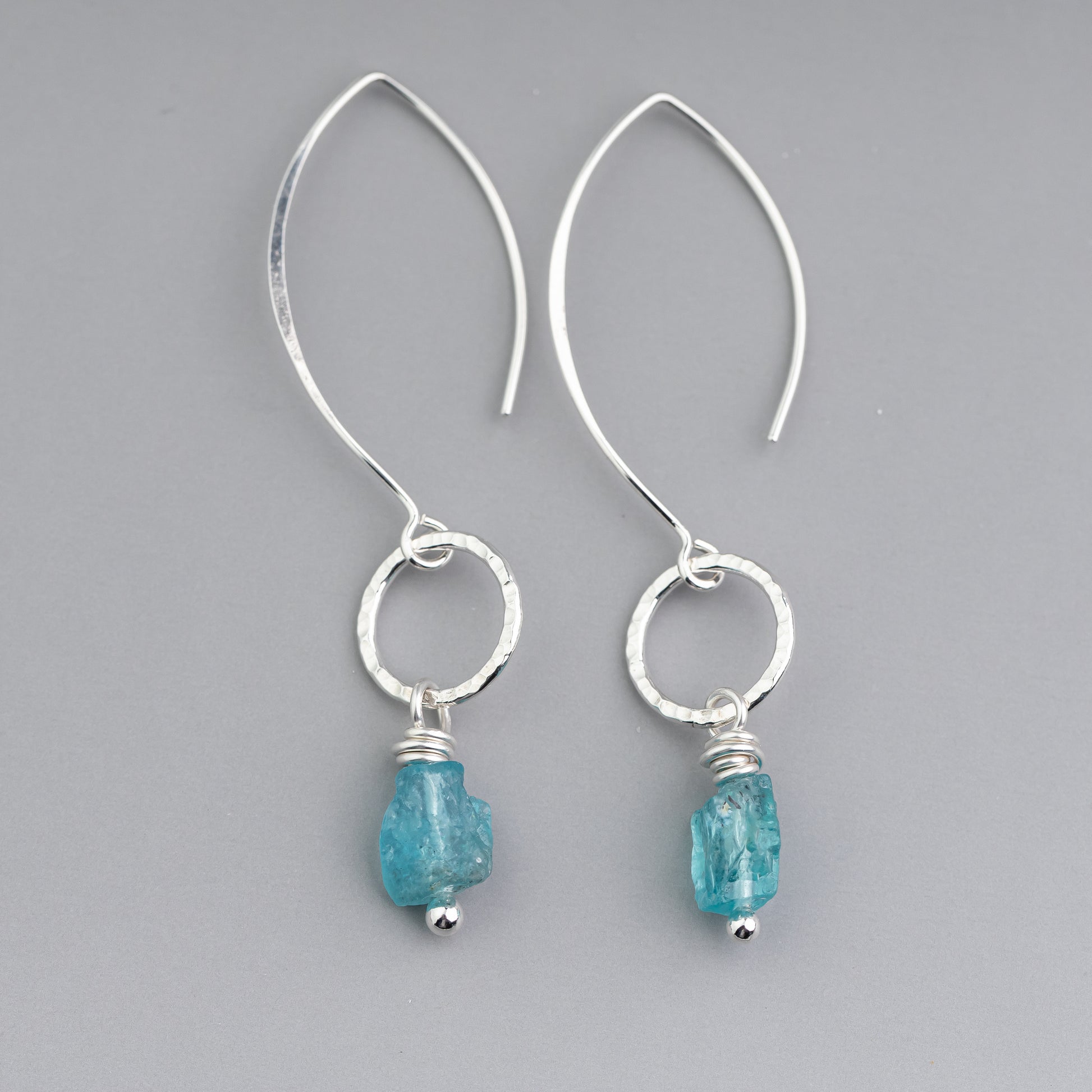 Handmade sterling silver earrings featuring natural raw blue apatite crystals, designed as lightweight everyday earrings with an organic, understated feel.