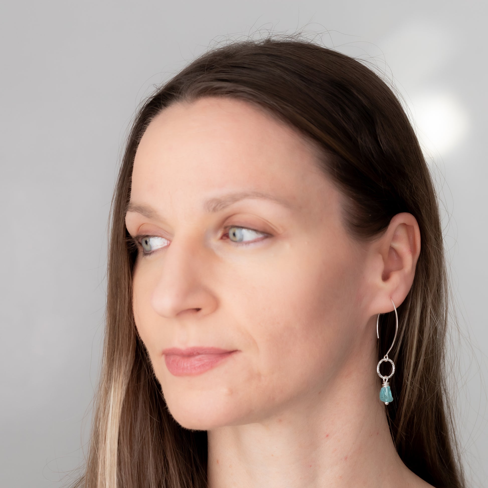 Because the stones are natural and left in their raw state, each pair varies slightly in size, shape, weight, and length. I carefully matched them into pairs that work really well together, even though they will never be perfectly identical, which is part of what makes them special. I designed these with a longer handmade ear wire so they have length without adding weight or extra movement. They hang straight and feel very easy to wear, giving you that long earring look without feeling fussy or heavy.