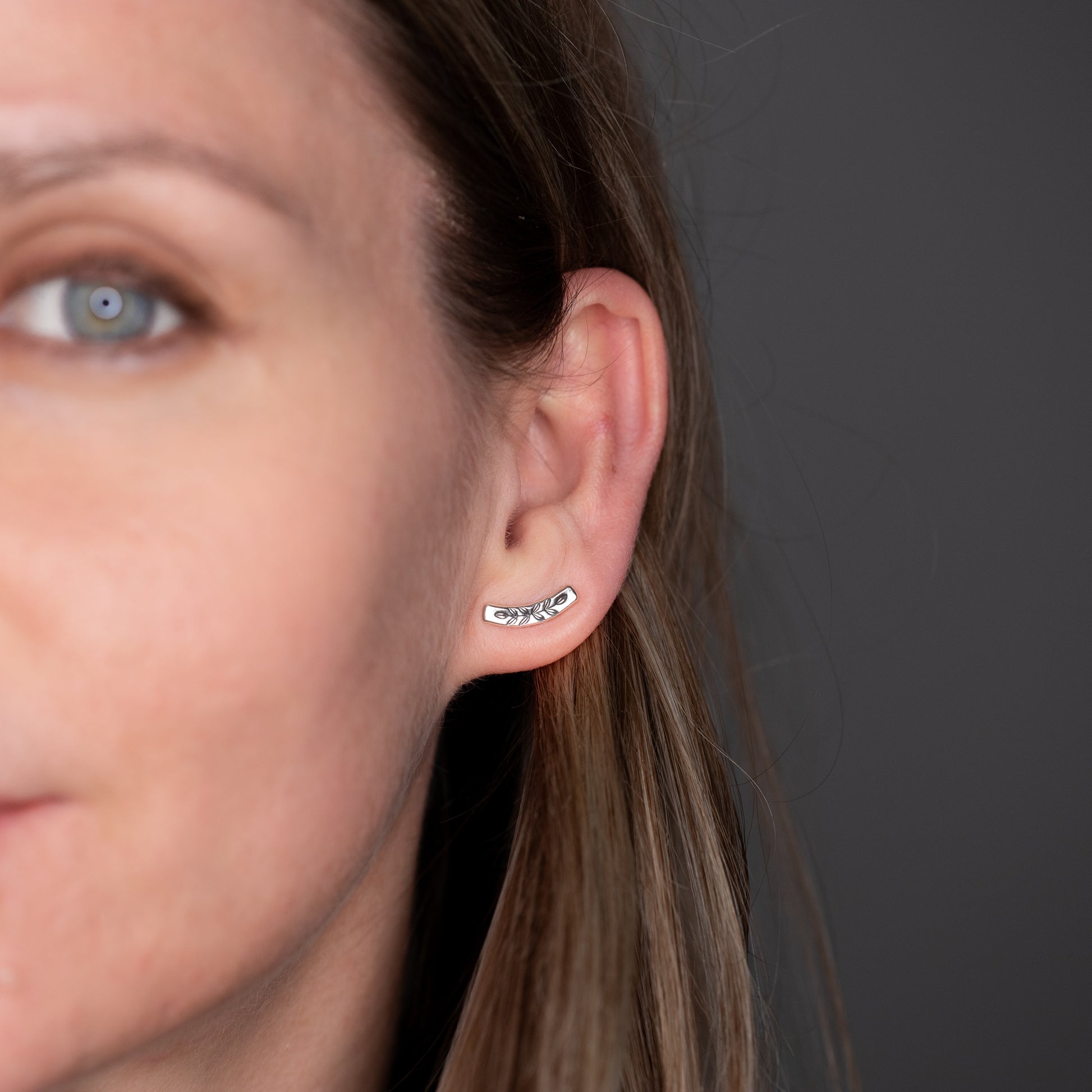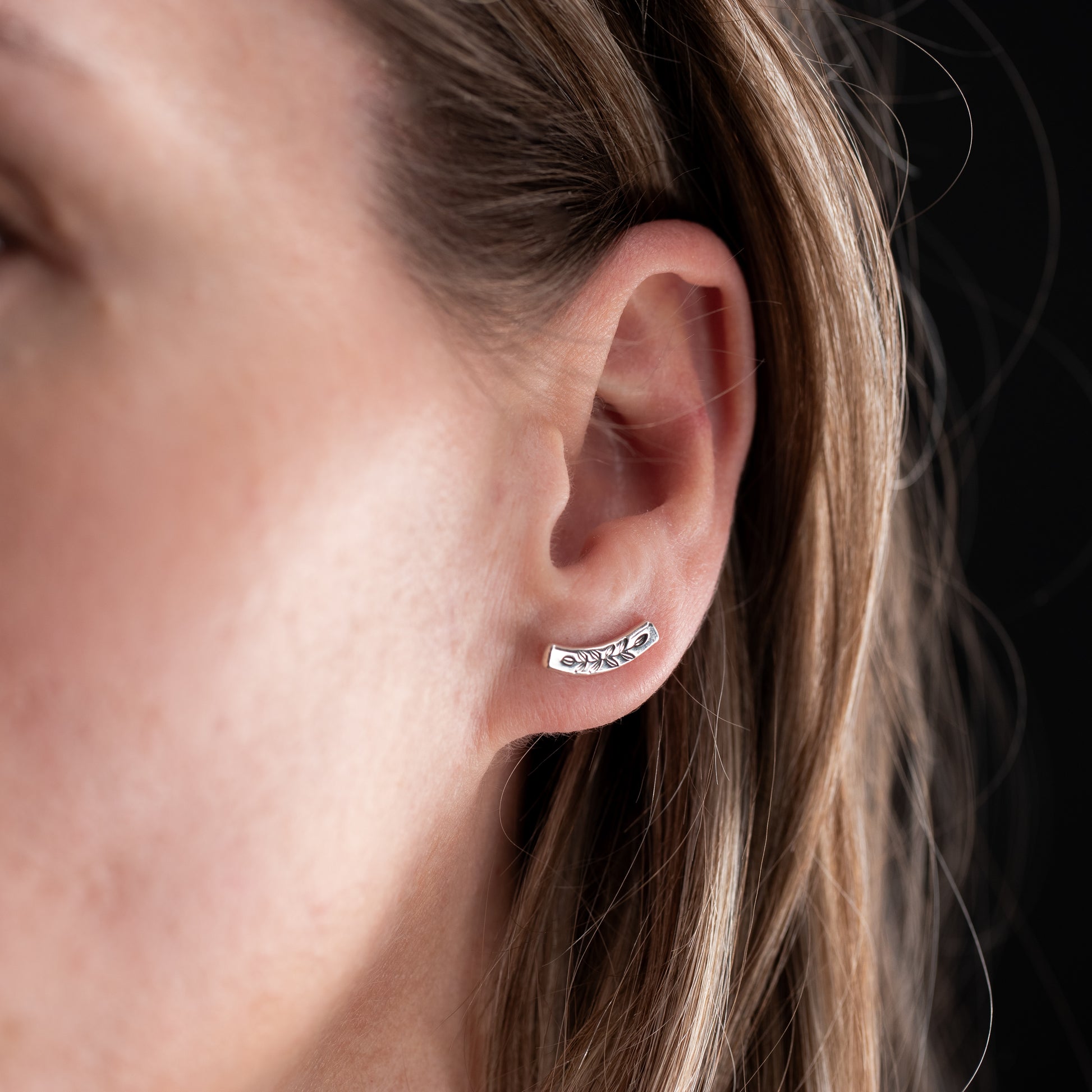 A delicate vine motif is hand-stamped onto solid sterling silver, then gently curved to climb up the ear, adding subtle dimension. The design is oxidized to enhance the details, while the high-polished finish catches the light beautifully.