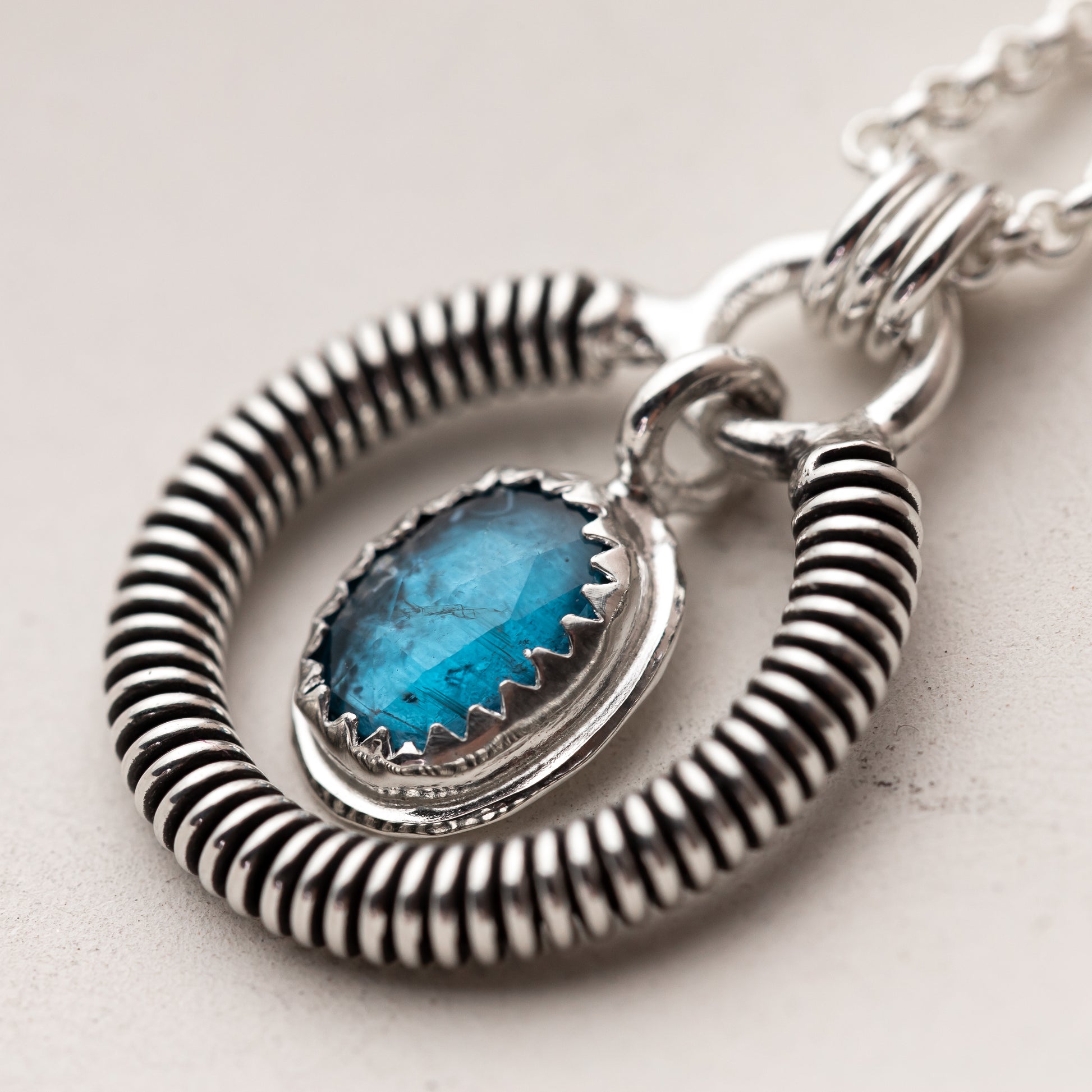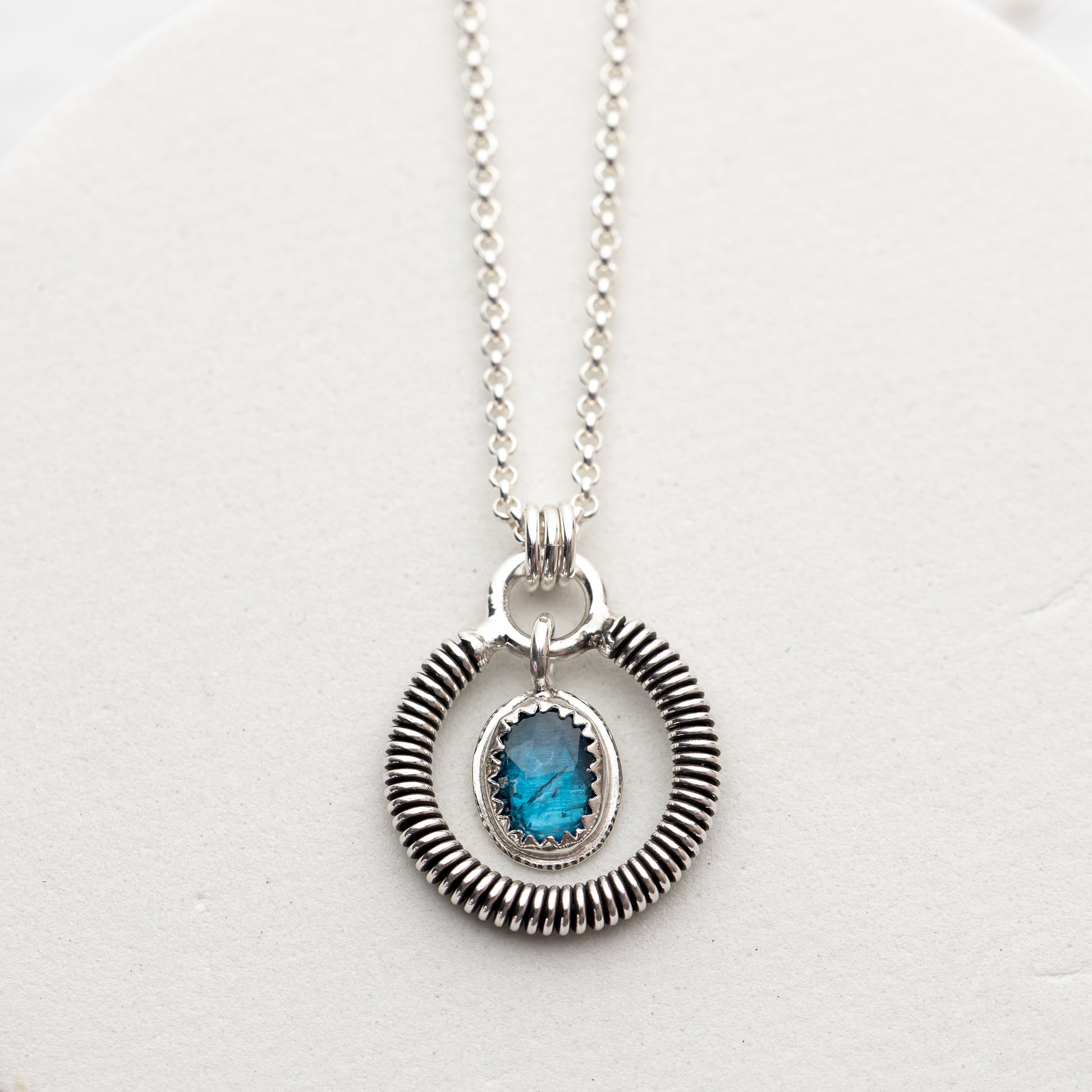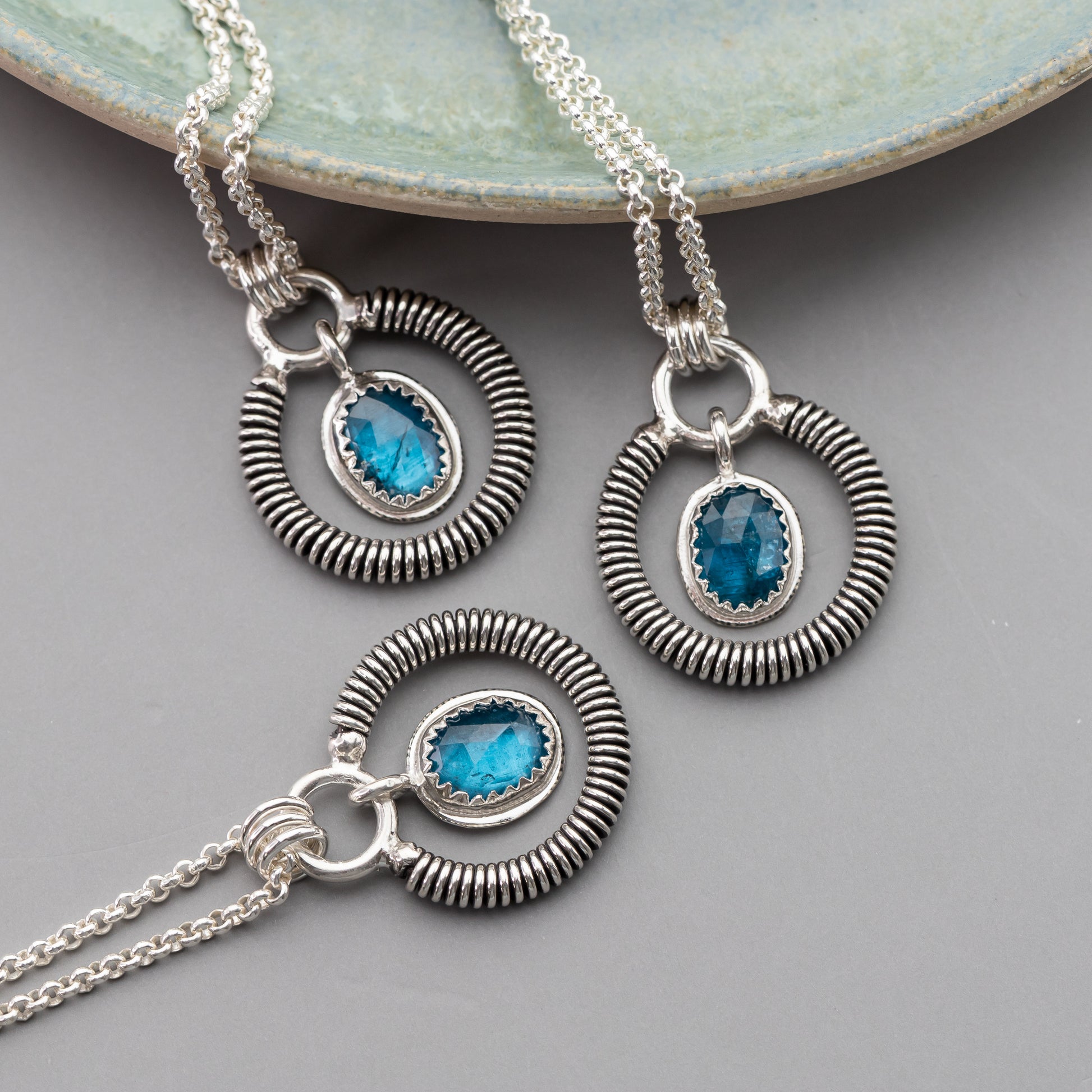 This unique necklace is handmade with solid sterling silver and a 2 carat teal kyanite gemstone. I created a custom bezel setting for the stone and dangled it within a circle which I hand wrapped with silver wire. I love the texture and dimension that the wire adds to the pendant! I oxidized the silver where it's wrapped to add contrast and make that high shine really pop. The chain is our 2mm cable chain, sturdy and perfect for everyday wear. The chain is adjustable from 18"-20" with a lobster claw clasp and built in extender chain. You can let us know if you need the length adjusted, we are happy to accommodate!