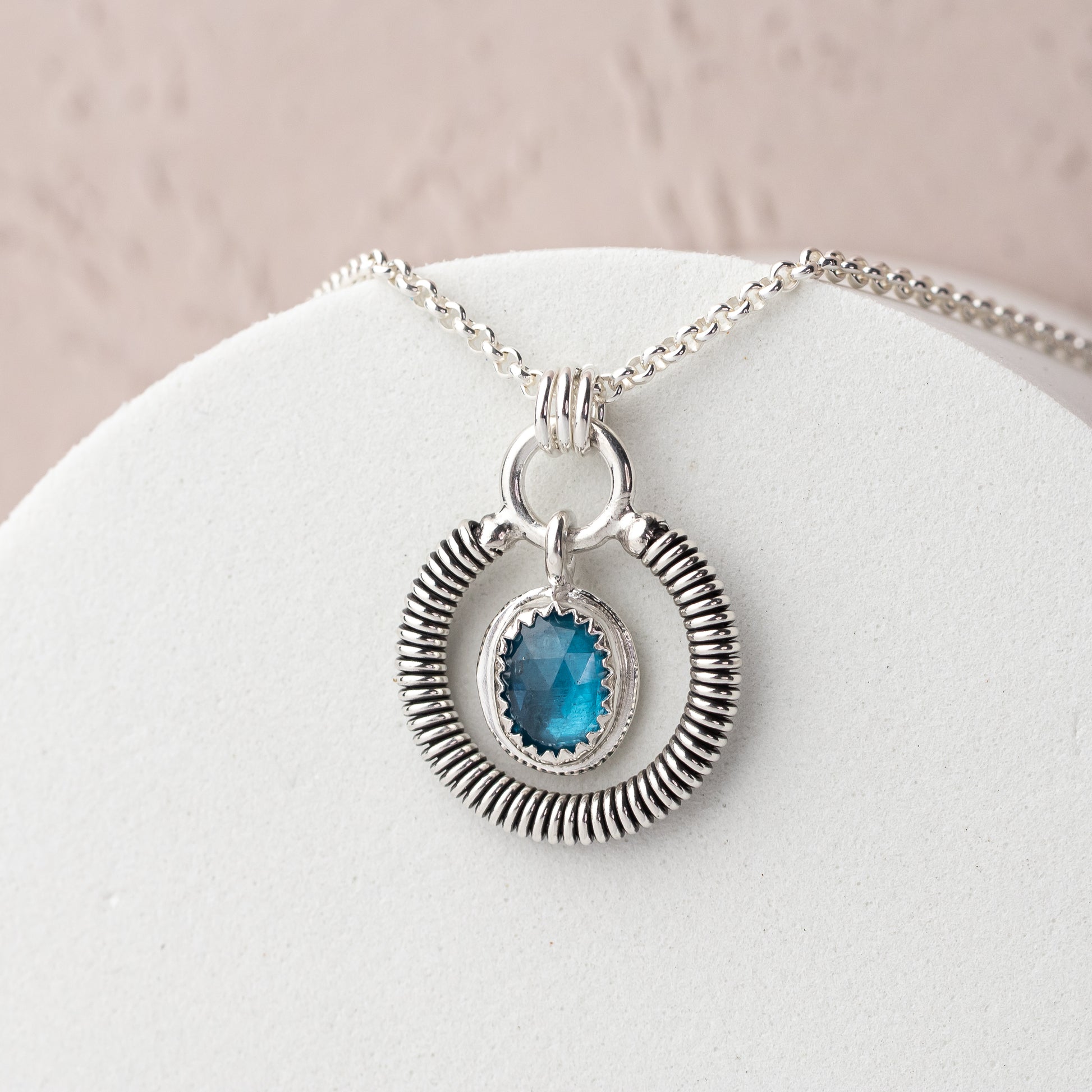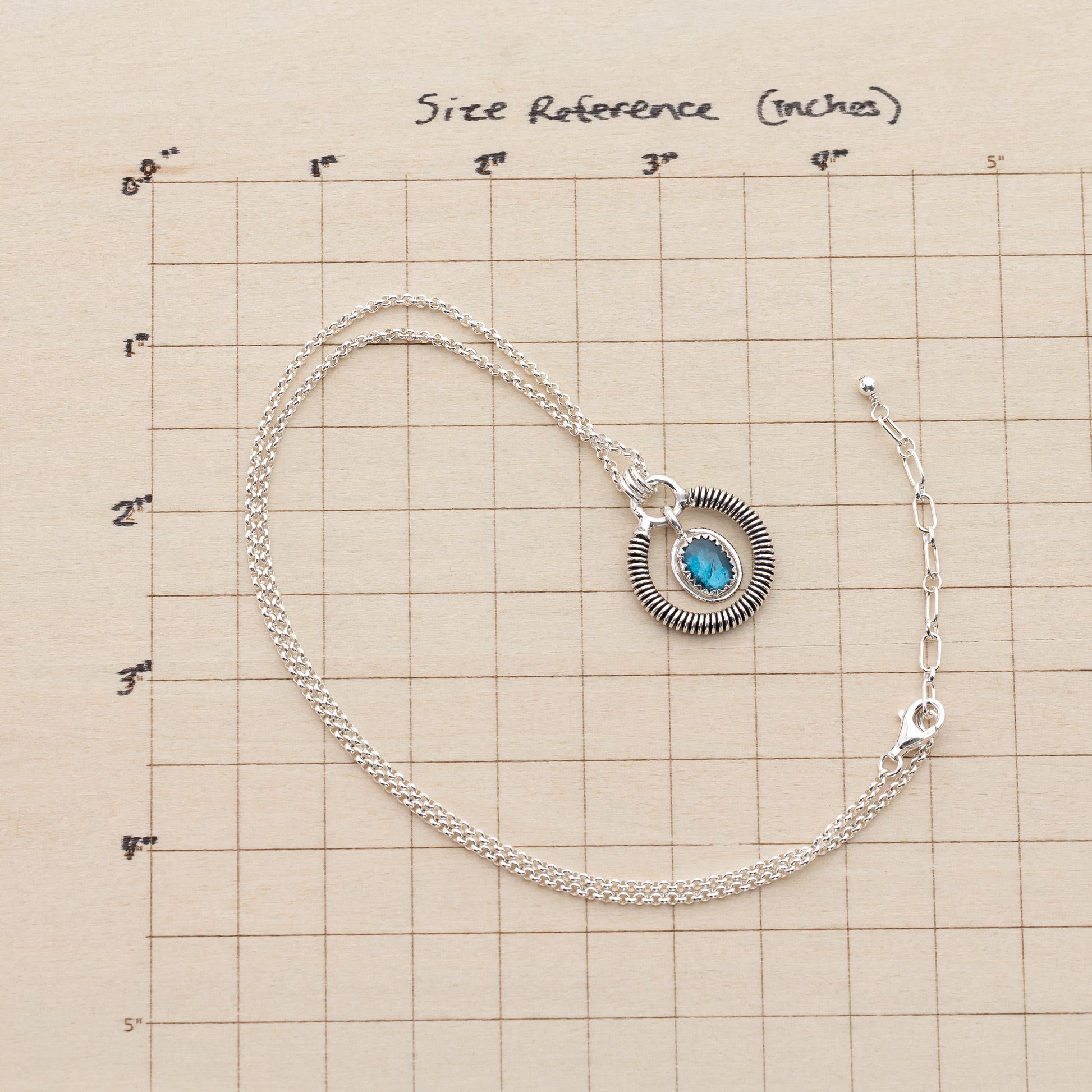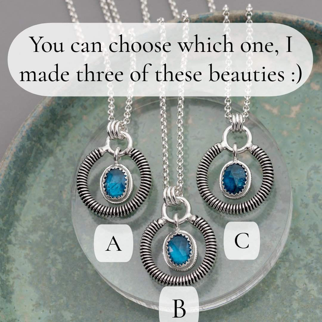 This unique necklace is handmade with solid sterling silver and a 2 carat teal kyanite gemstone. I created a custom bezel setting for the stone and dangled it within a circle which I hand wrapped with silver wire. I love the texture and dimension that the wire adds to the pendant! I oxidized the silver where it's wrapped to add contrast and make that high shine really pop. The chain is our 2mm cable chain, sturdy and perfect for everyday wear. The chain is adjustable from 18"-20" with a lobster claw clasp and built in extender chain. You can let us know if you need the length adjusted, we are happy to accommodate!